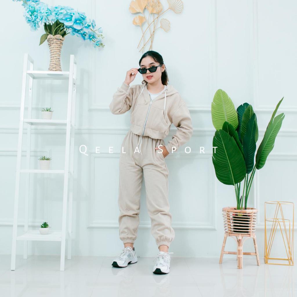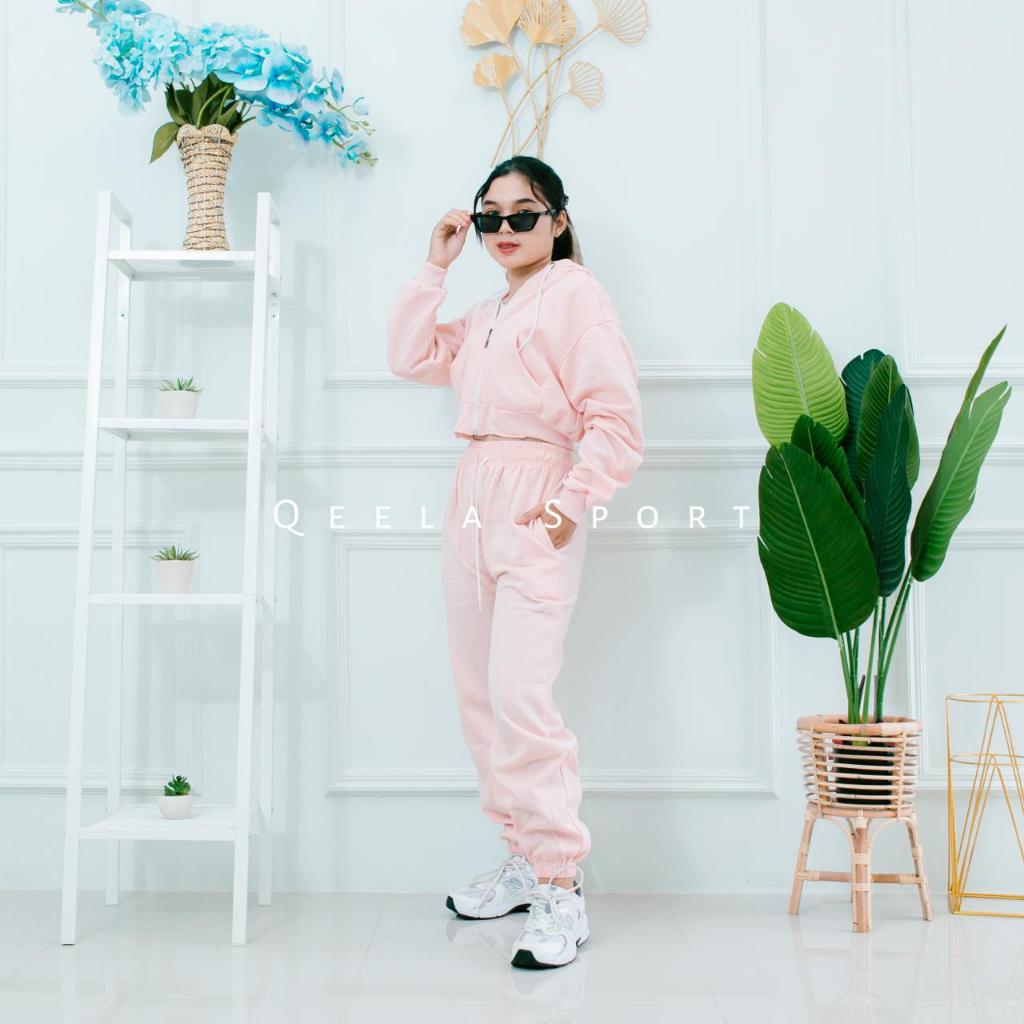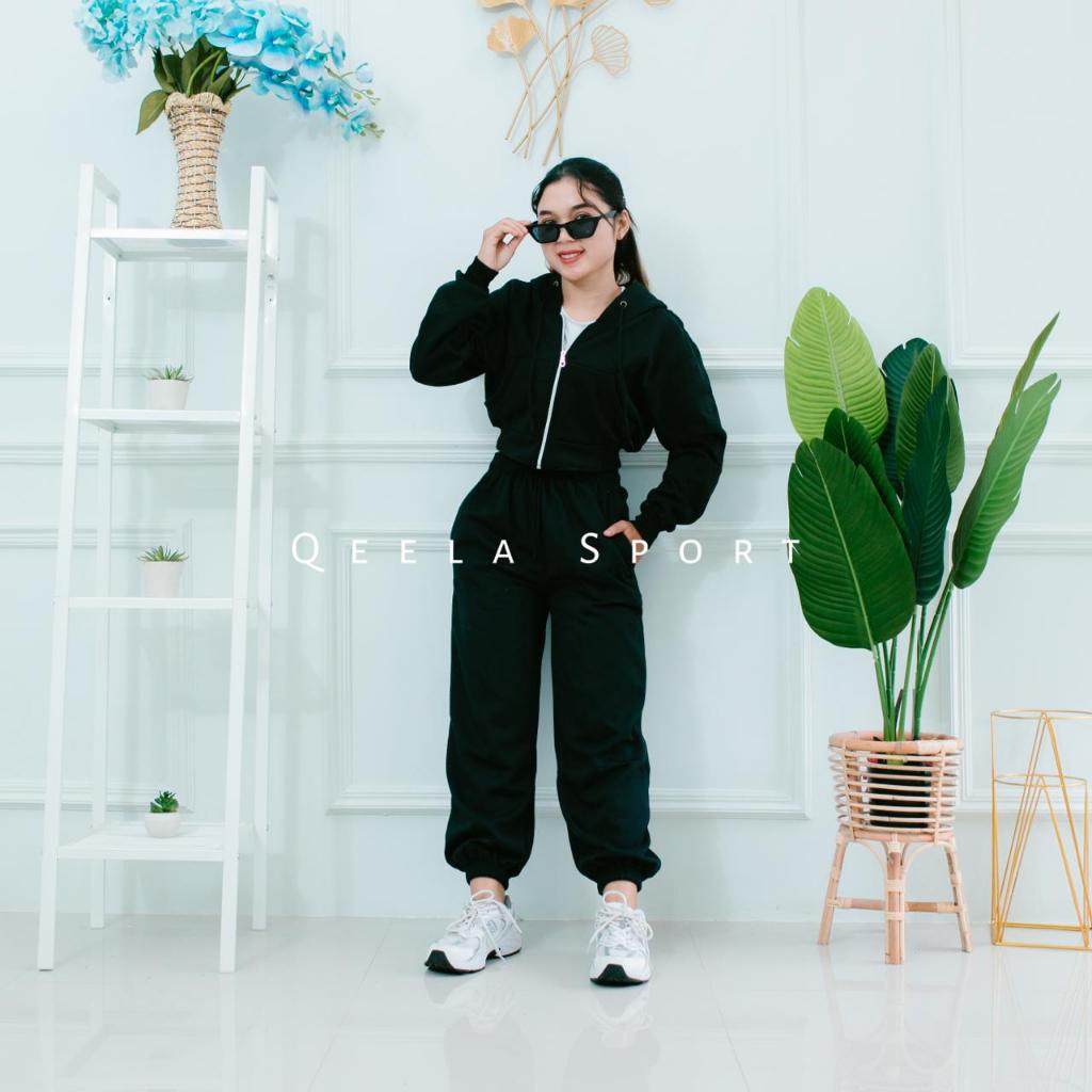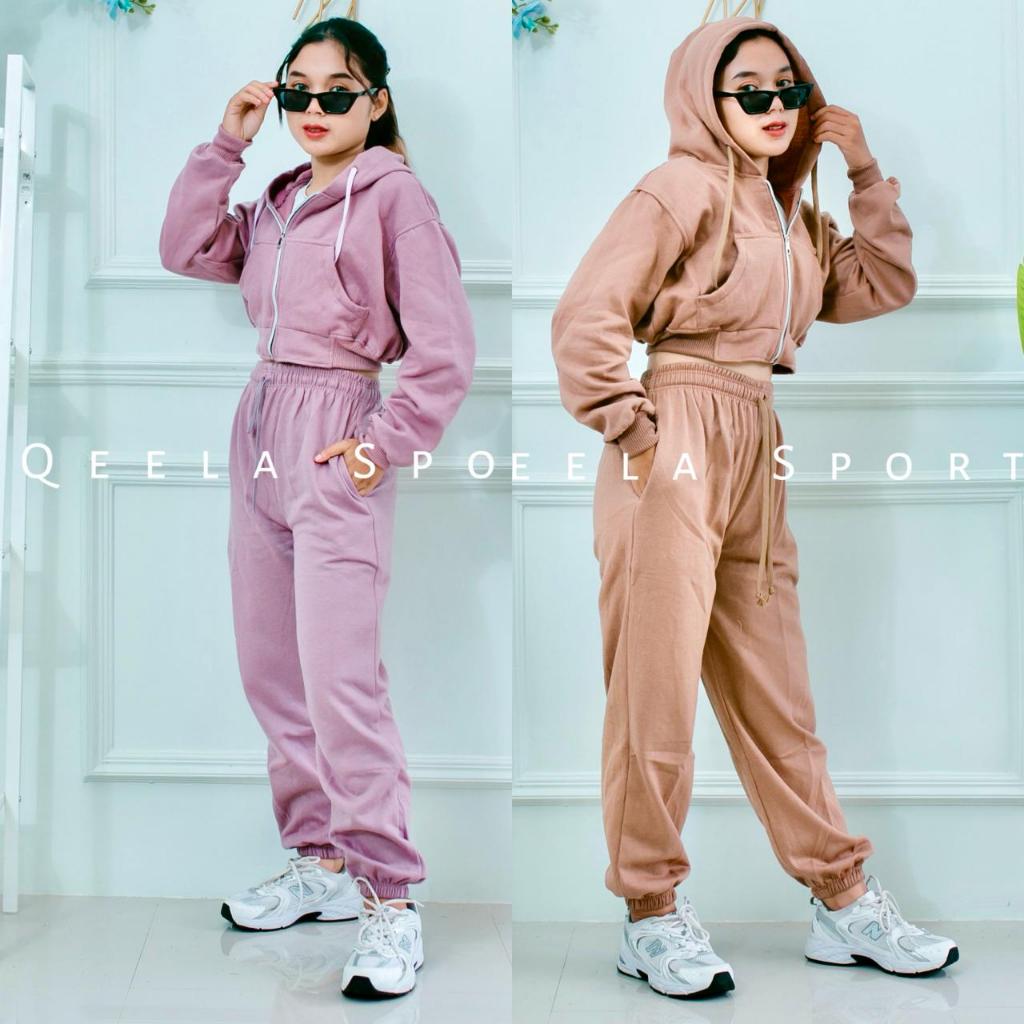 QeelaOfficial - ONE SET HOODIE ZIPPER CROP + LONG JOGGER PANTS SWEATPANTS WOMEN'S SUIT KOREAN STYLE