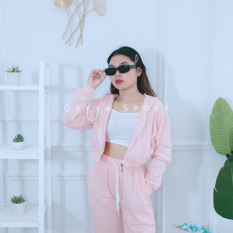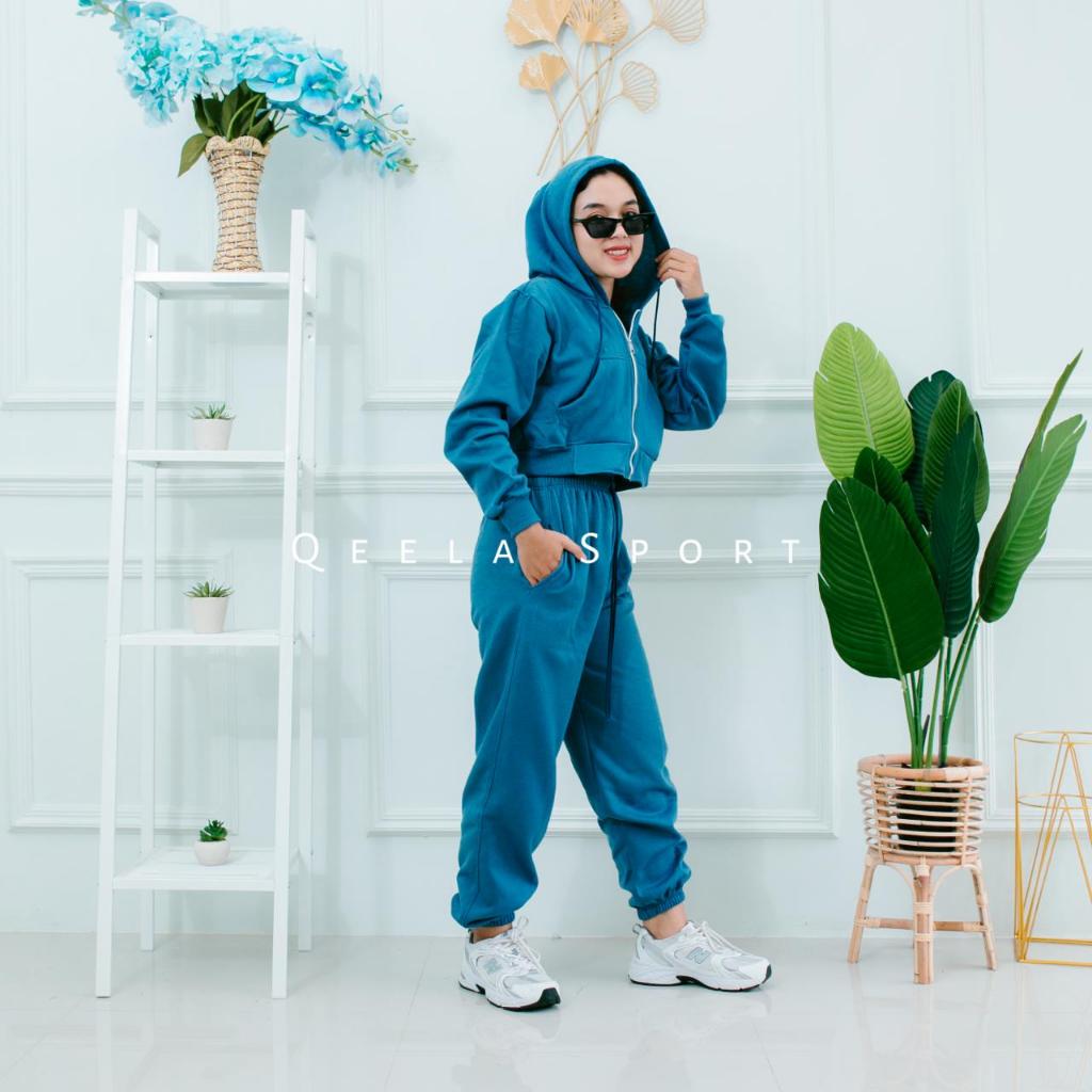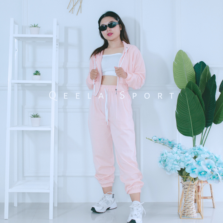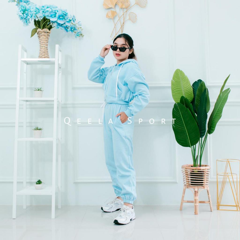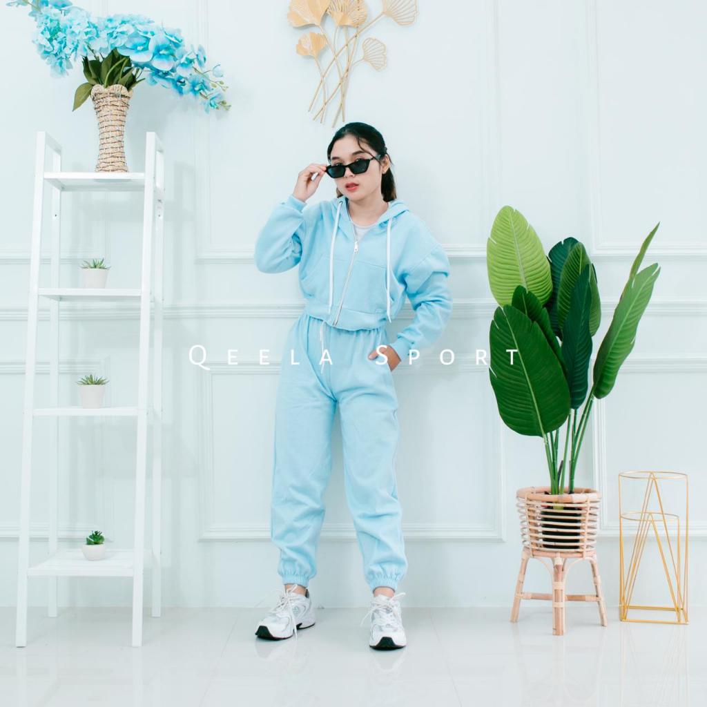 QeelaOfficial - ONE SET HOODIE ZIPPER CROP + LONG JOGGER PANTS SWEATPANTS WOMEN'S SUIT KOREAN STYLE