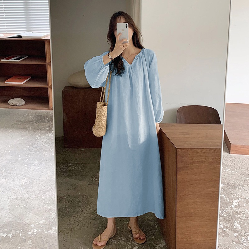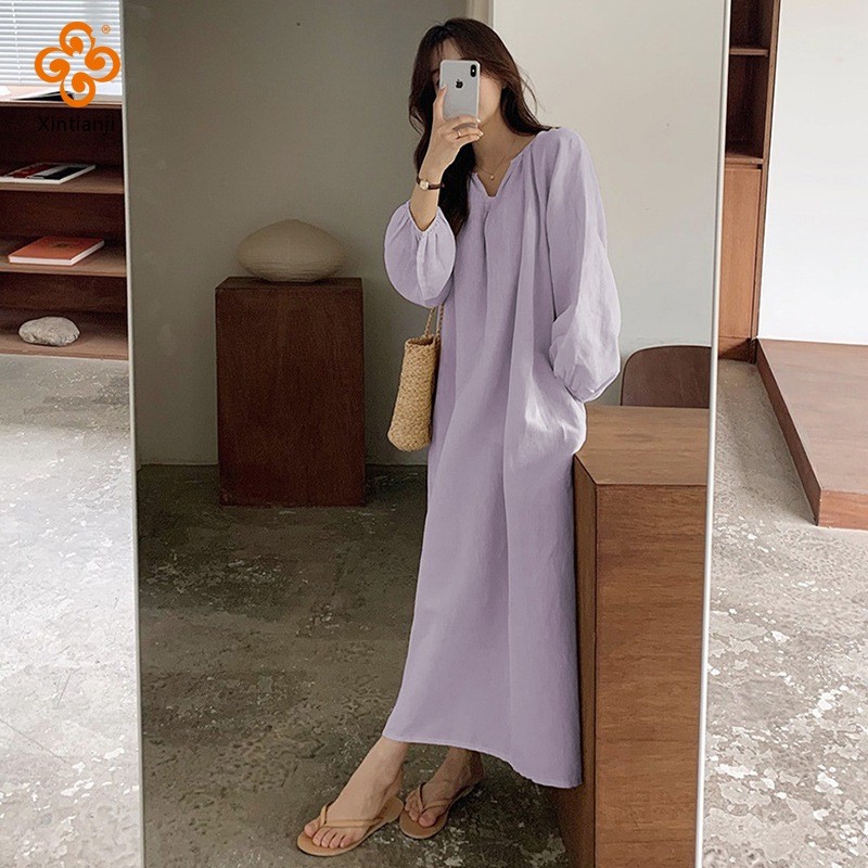100% Cotton Women Dress Casual Solid V-Neck Long Sleeve Spring Autumn Maxi Long Dresses For Women Comfortable Homewear