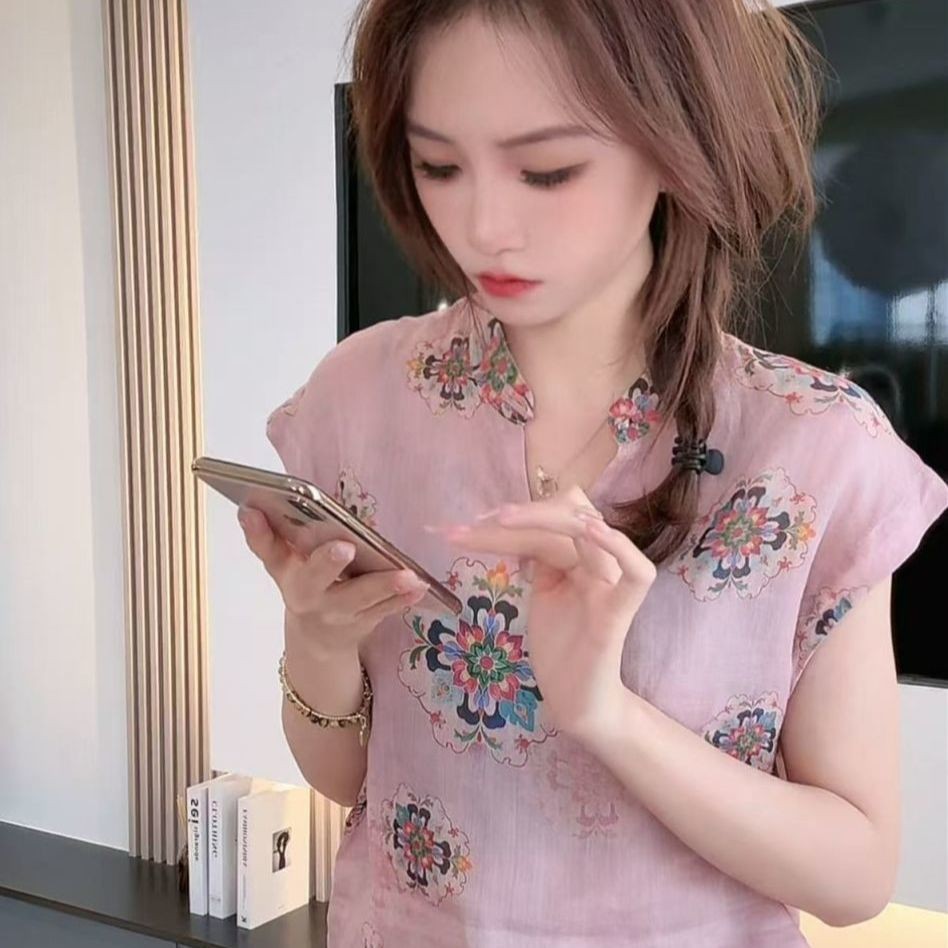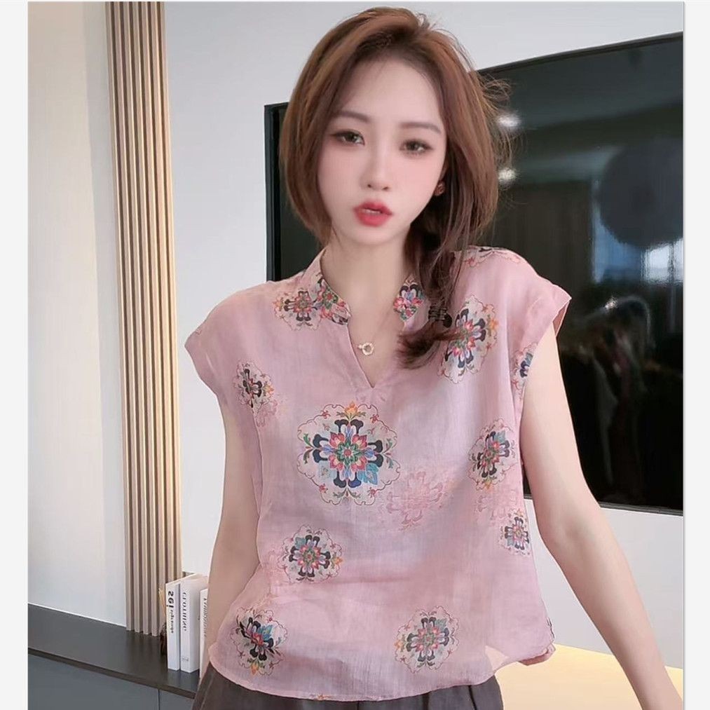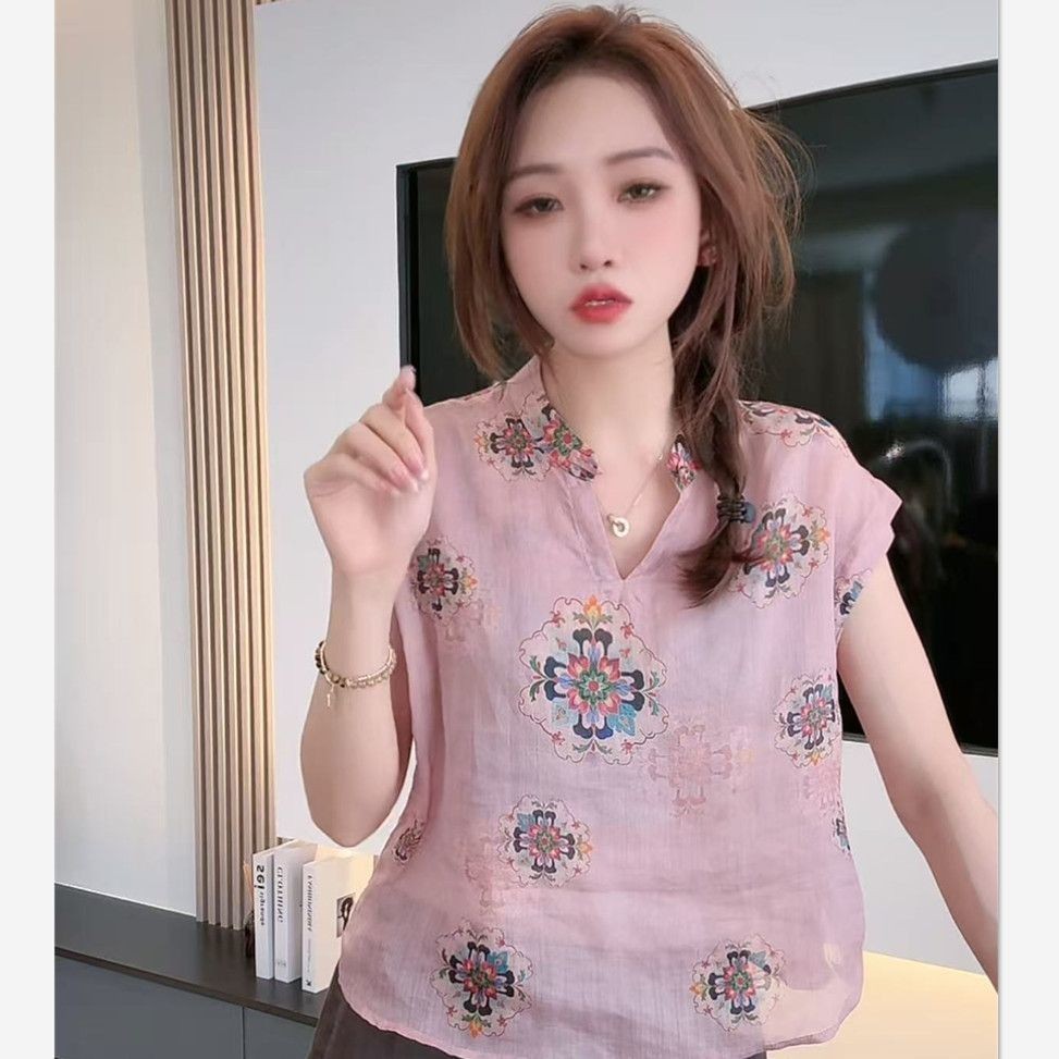 New Chinese Style Chinese Style Fashionable Floral Slightly Transparent V-Neck Short Pink Flying Sleeve T-Shirt Summer Thin Style Temperament Age-Reducing Comfortable Loose All @