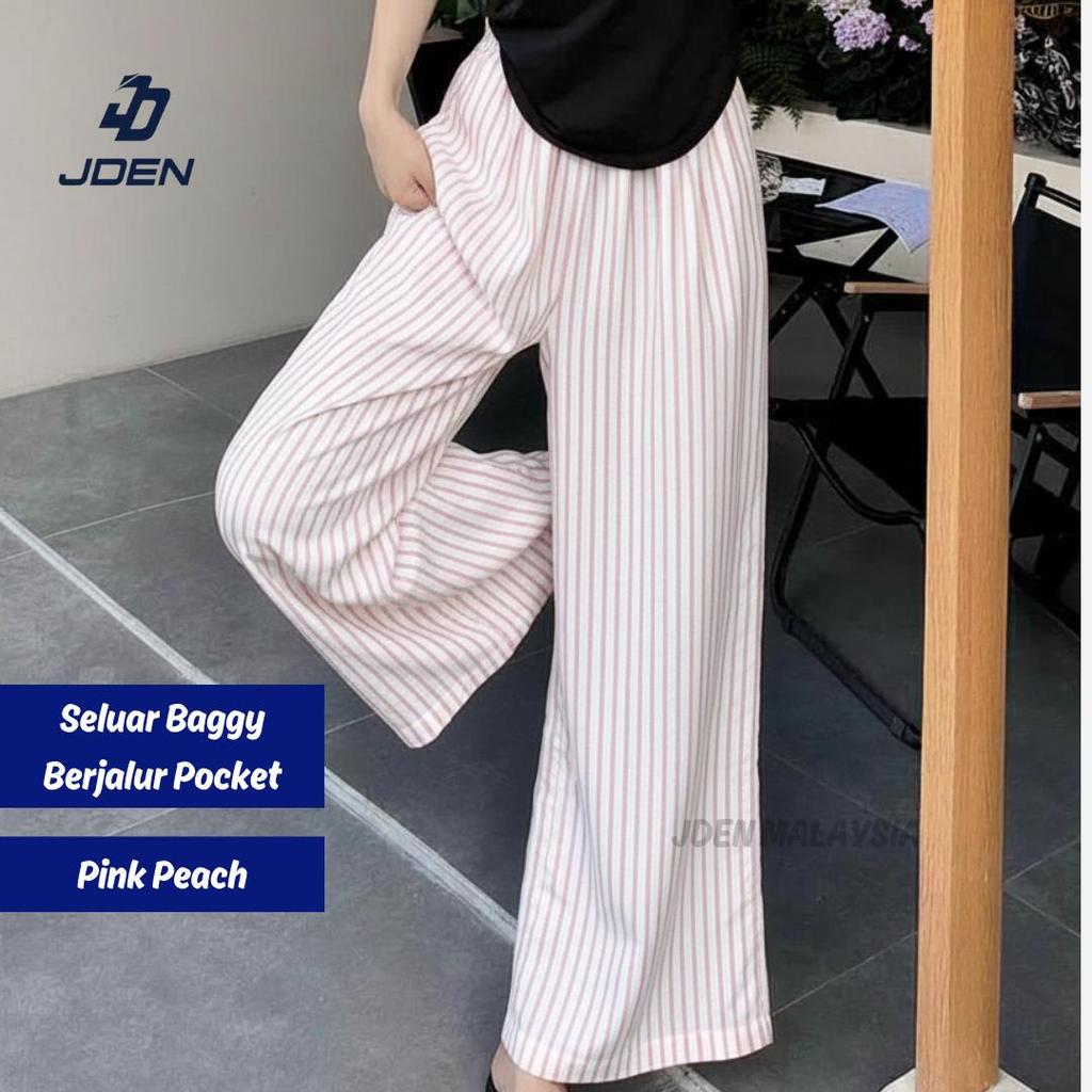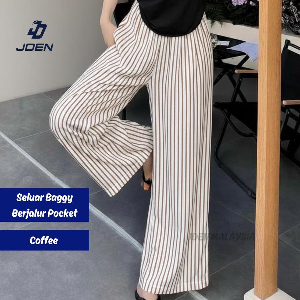 JDEN Seluar Baggy Berjalur - Wide Leg Stripe Pant Viral - Seluar Belang Perempuan Pocket Bertali Pinggang Bergetah