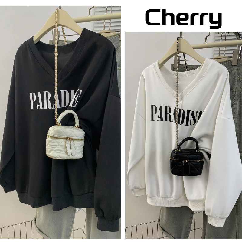 Cherryshop 💕 Ready Stock 💕 Oversize Long-Sleeved Korean Style Woman Spring V-Neck Middle Sleeves T-shirt With Letters Printed (White/Black)