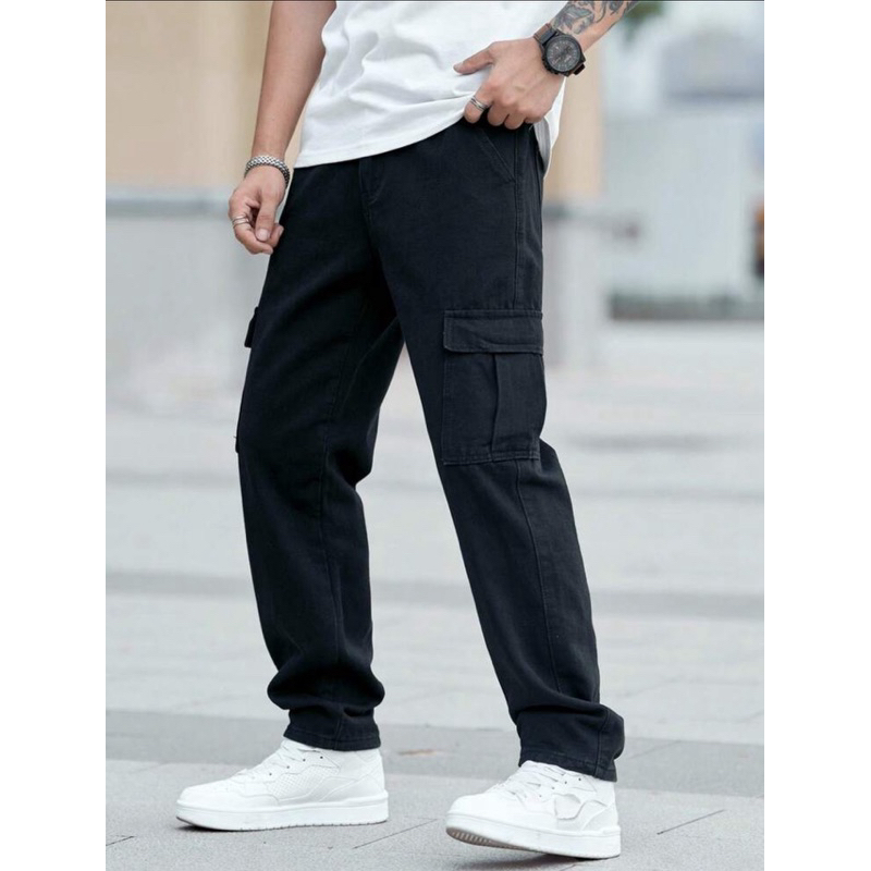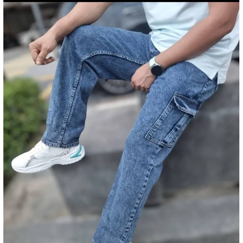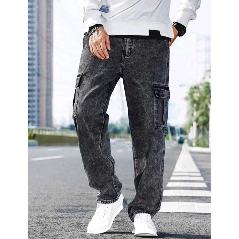 Seluar Jeans Lelaki Cargo 6 Pocket Acid Wash Cargo Jeans kain ( Non Stretchable ) straight Cut Seluar Cargo Jeans