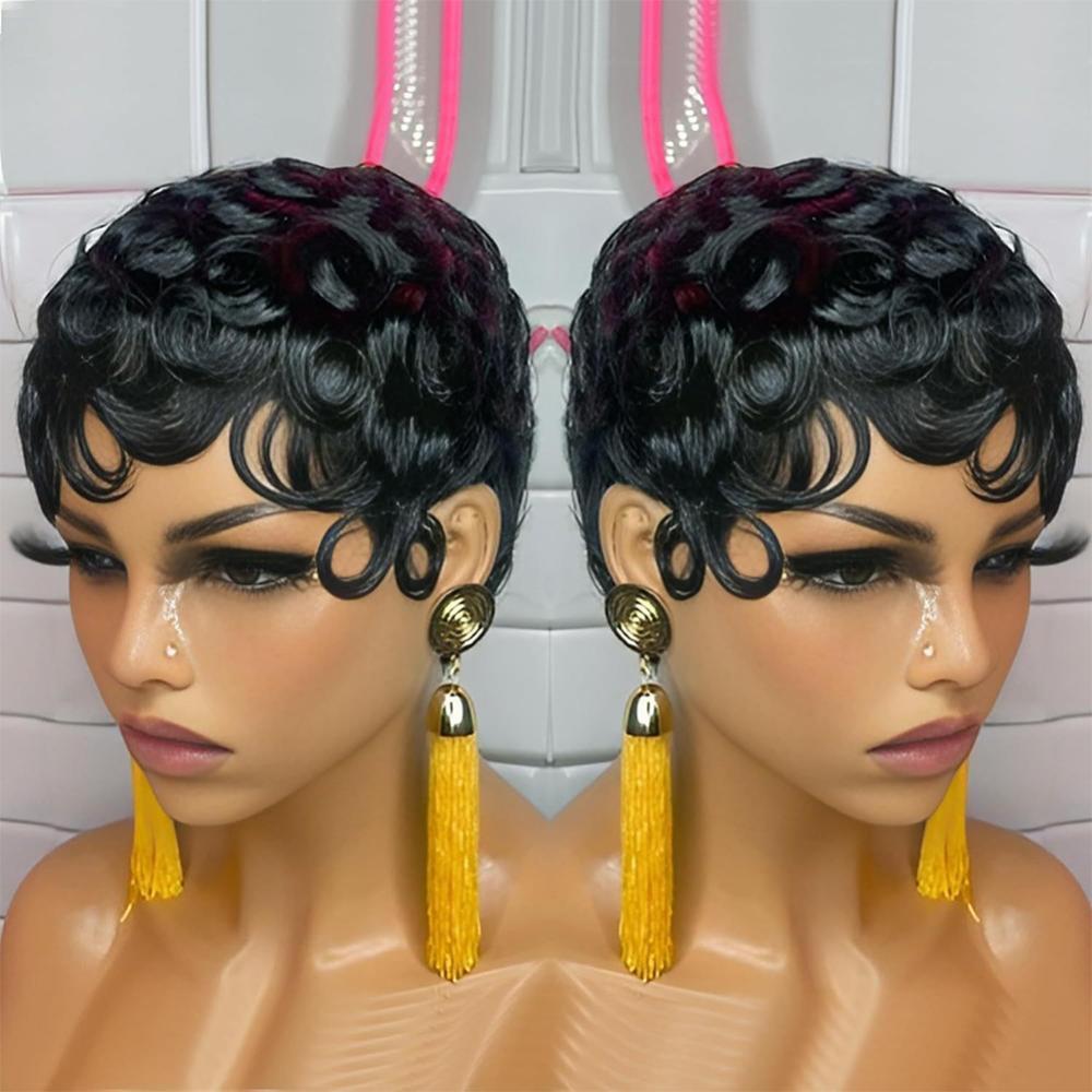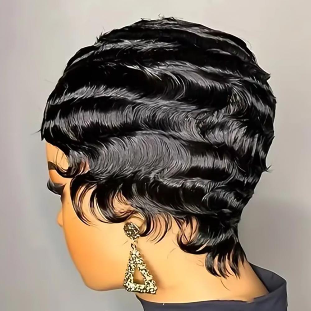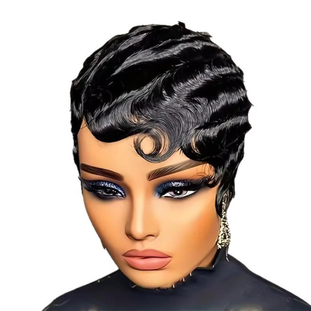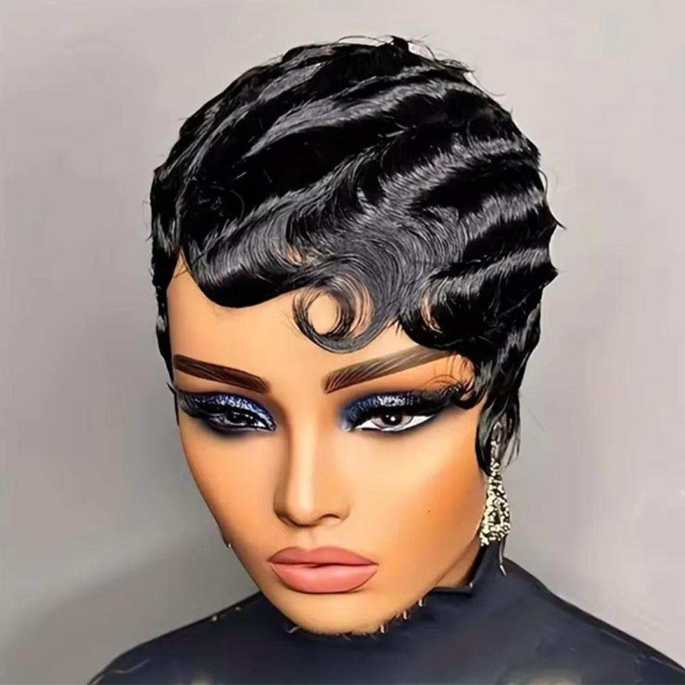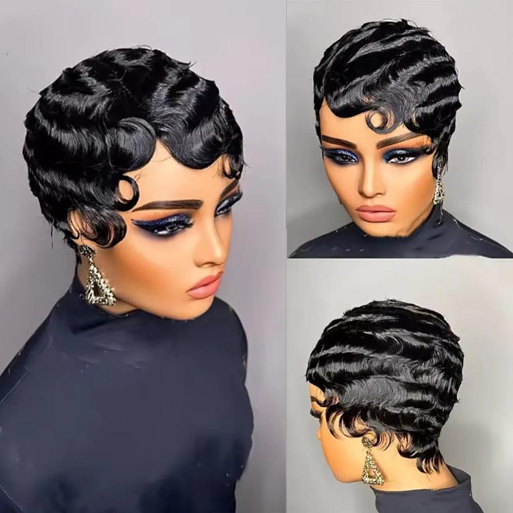 DIGIFOUNDER Retro Black Ocean Wave Human Hair Wig Short Pixie Cut Finger Wave Style Wig Finger Wave Wig Short Pixie Cut Women Wigs A3F8