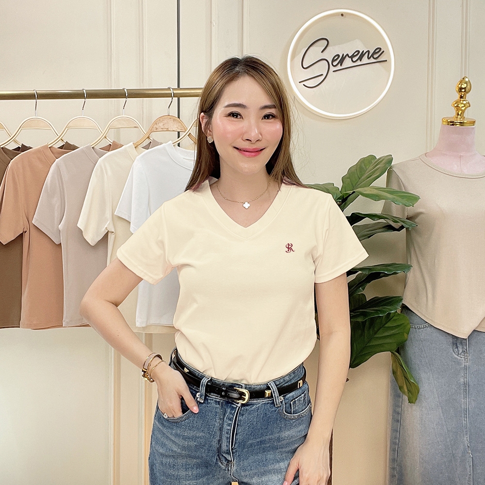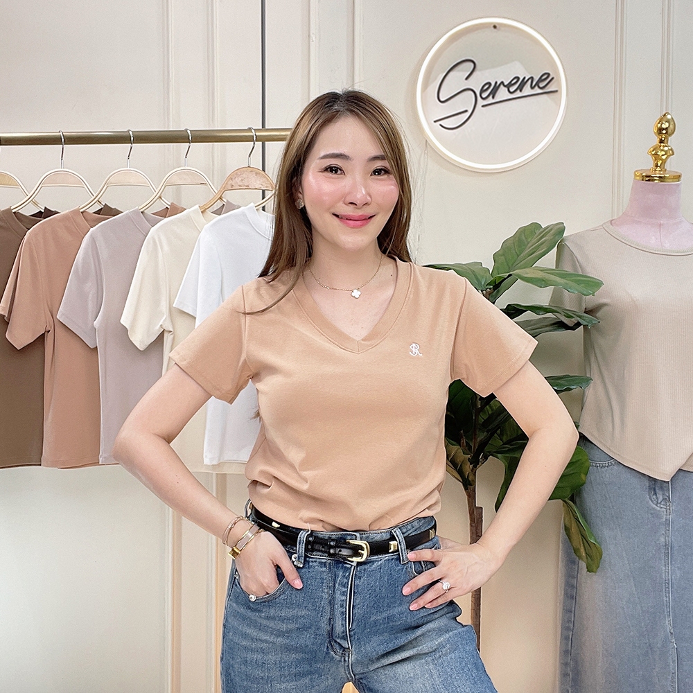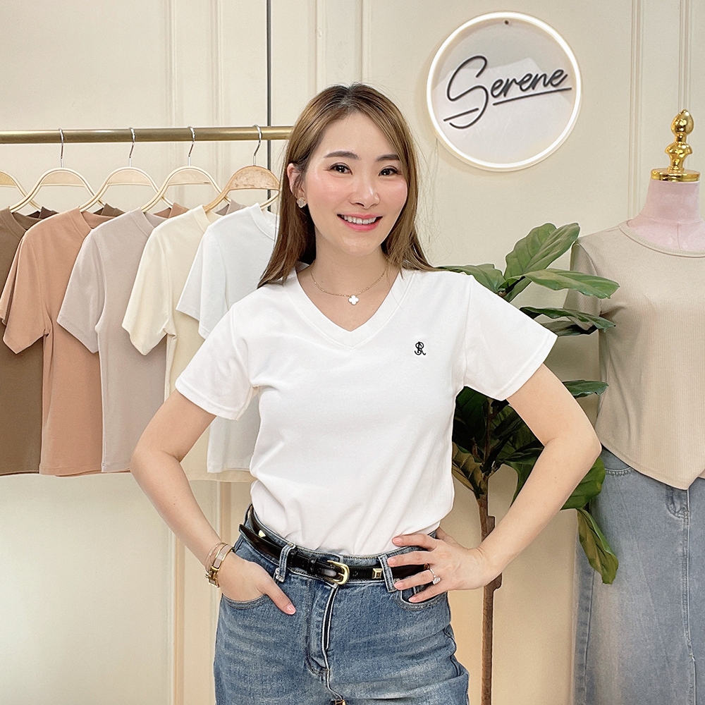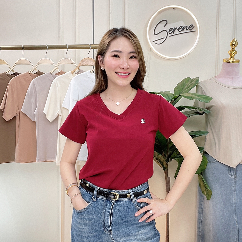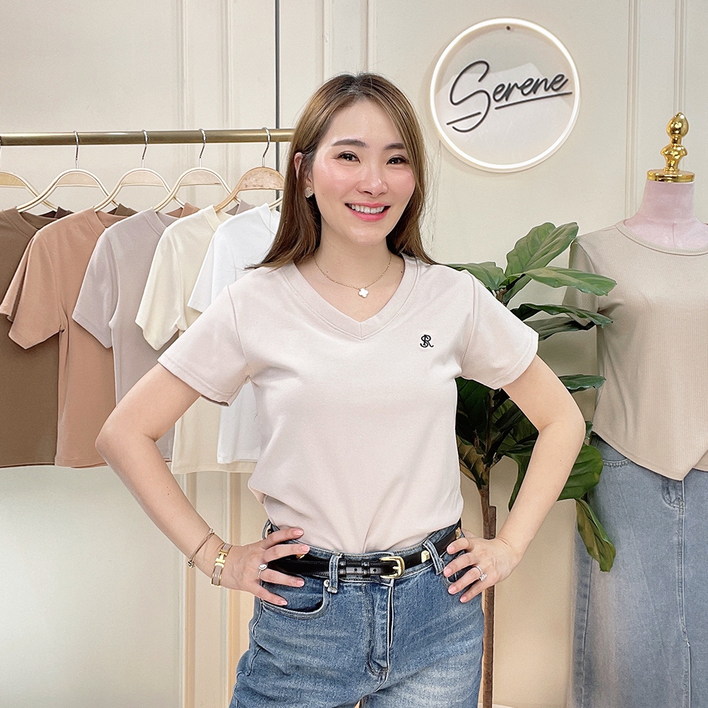 Serene's Choice V-Neck Short-Sleeved Shirt Japanese Premium Cotton Fabric Embroidered With Serene Logo Short Sleeve Baju Perempuan Baju T Shirt Perempuan