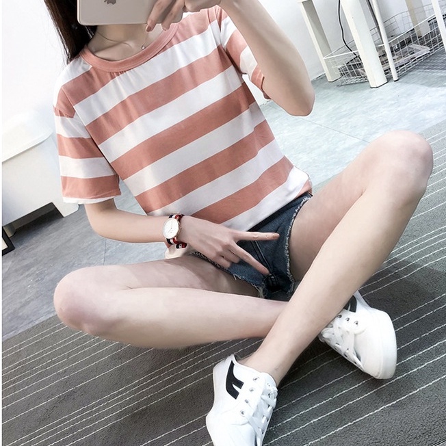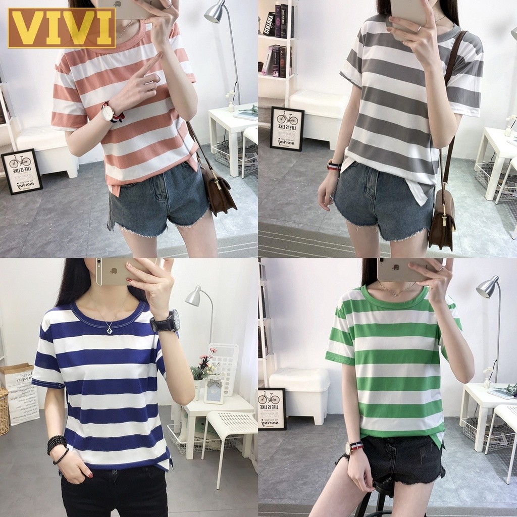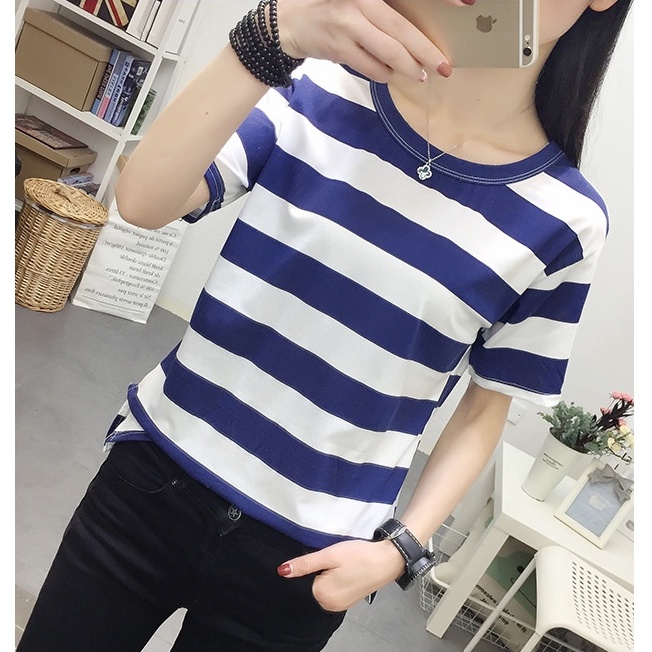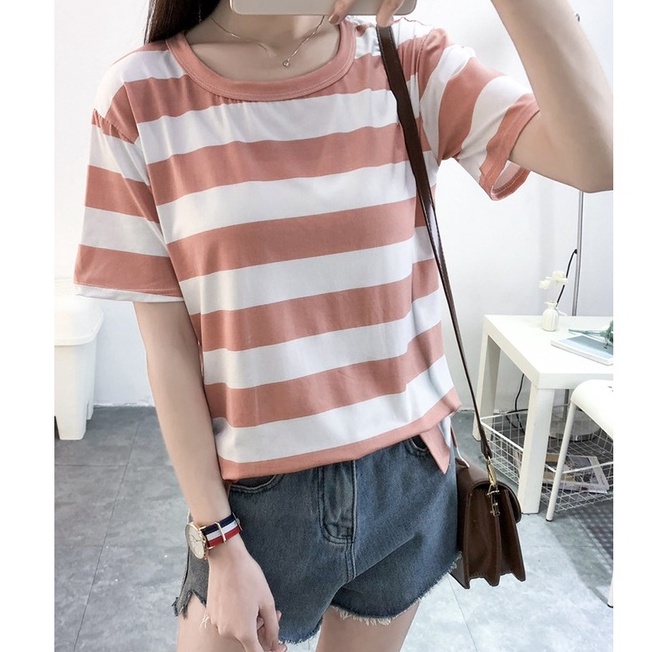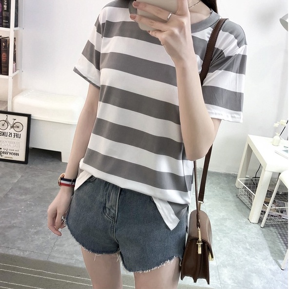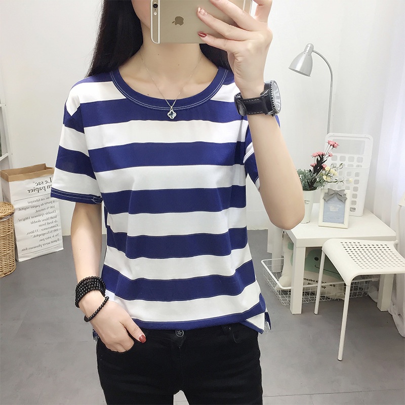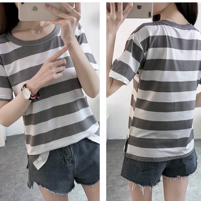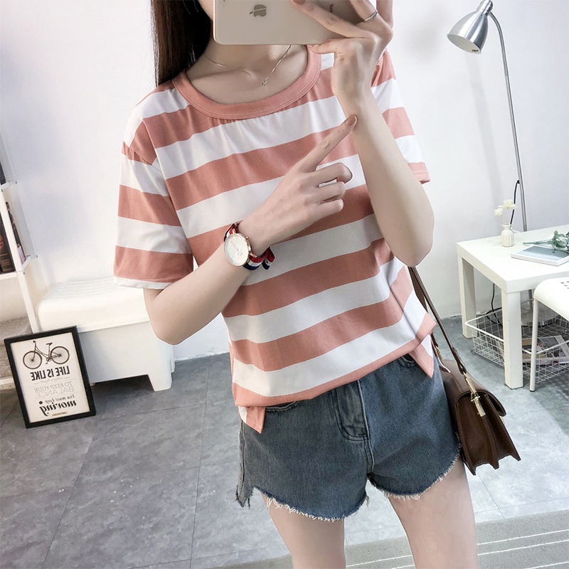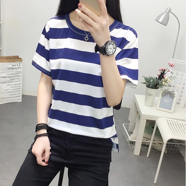 Korean version Stripe Color Women's Short Sleeve Loose Pullover Split T-shirt T36