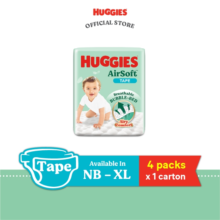 [Bundle of 4] HUGGIES AirSoft Tape NB68/S58/M52/L44/XL38 - Breathable and Soft Premium Diapers for Baby
