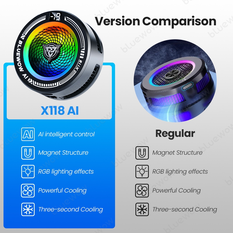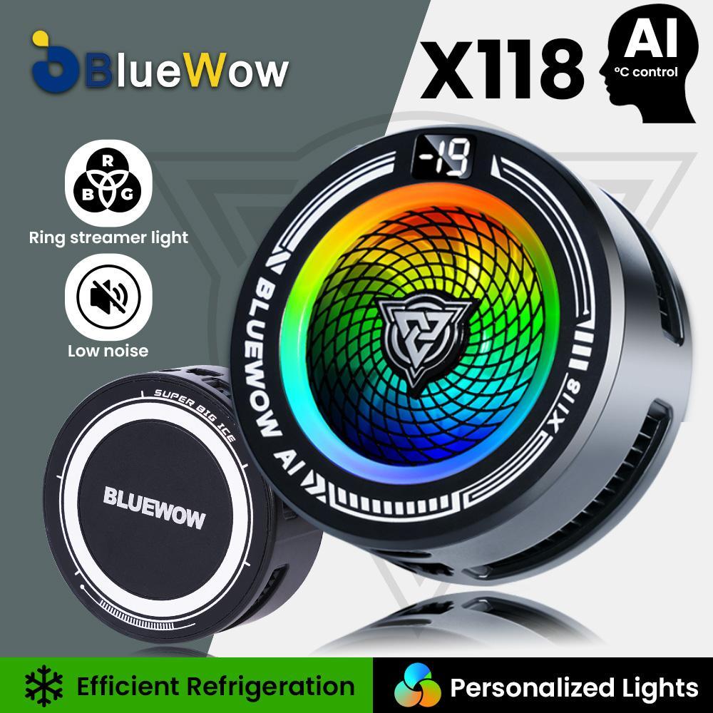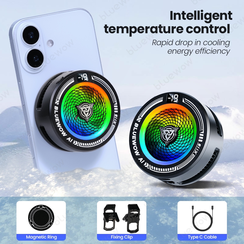BlueWow X118 AI Semiconductor Phone Cooler Magnetic Clip 2 in 1 Strong Cooling AI Smart Temperature Control RGB Lights for Phone Gaming