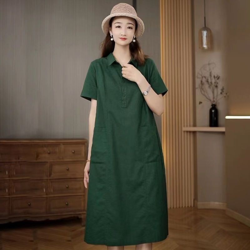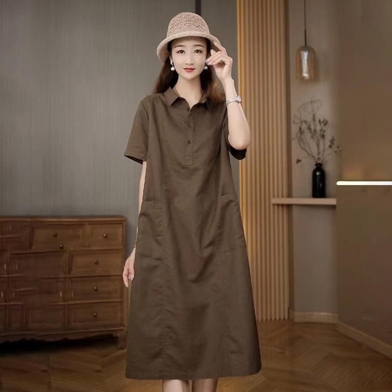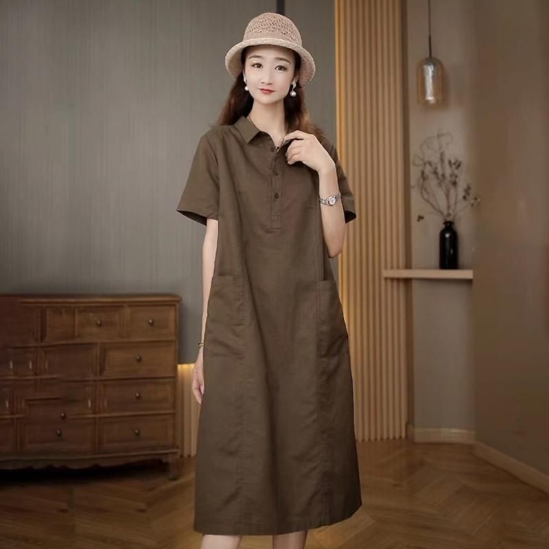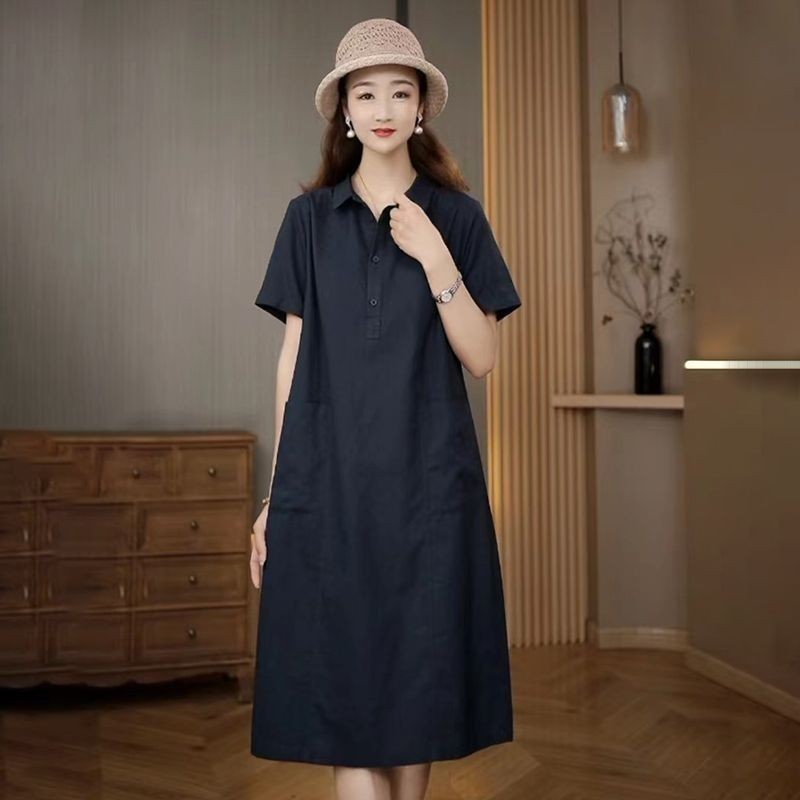✨Classy Cotton Linen Dress Simple Short-Sleeved Collar Dress Large Size Loose Pocket Mid-Length Skirt PO2