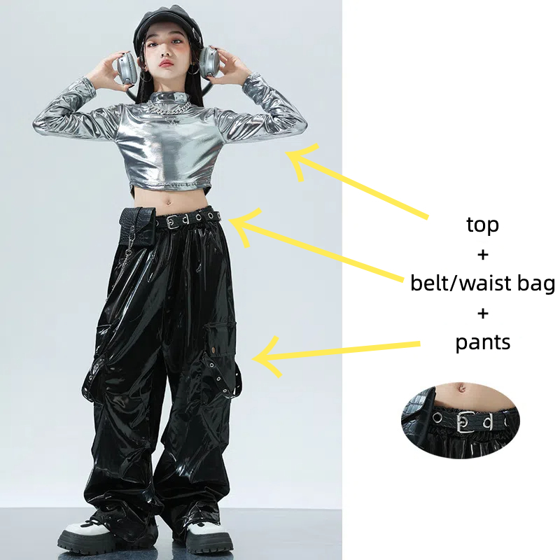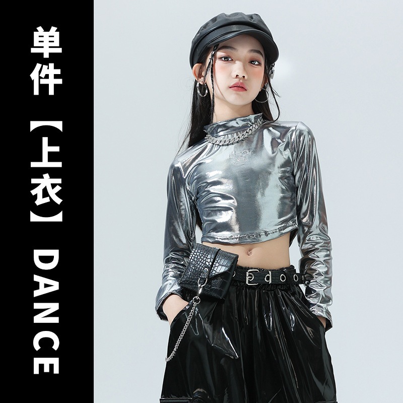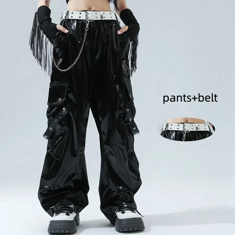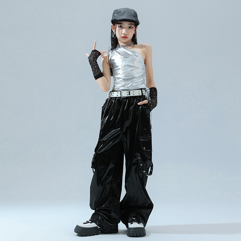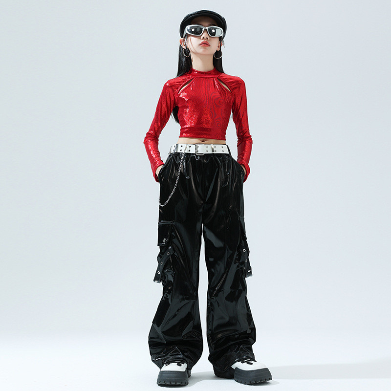 Red Hollowed Out Top+black Leather Pants Children's Jazz Dance Performance Costume Cool Hip-hop Clothes Set
