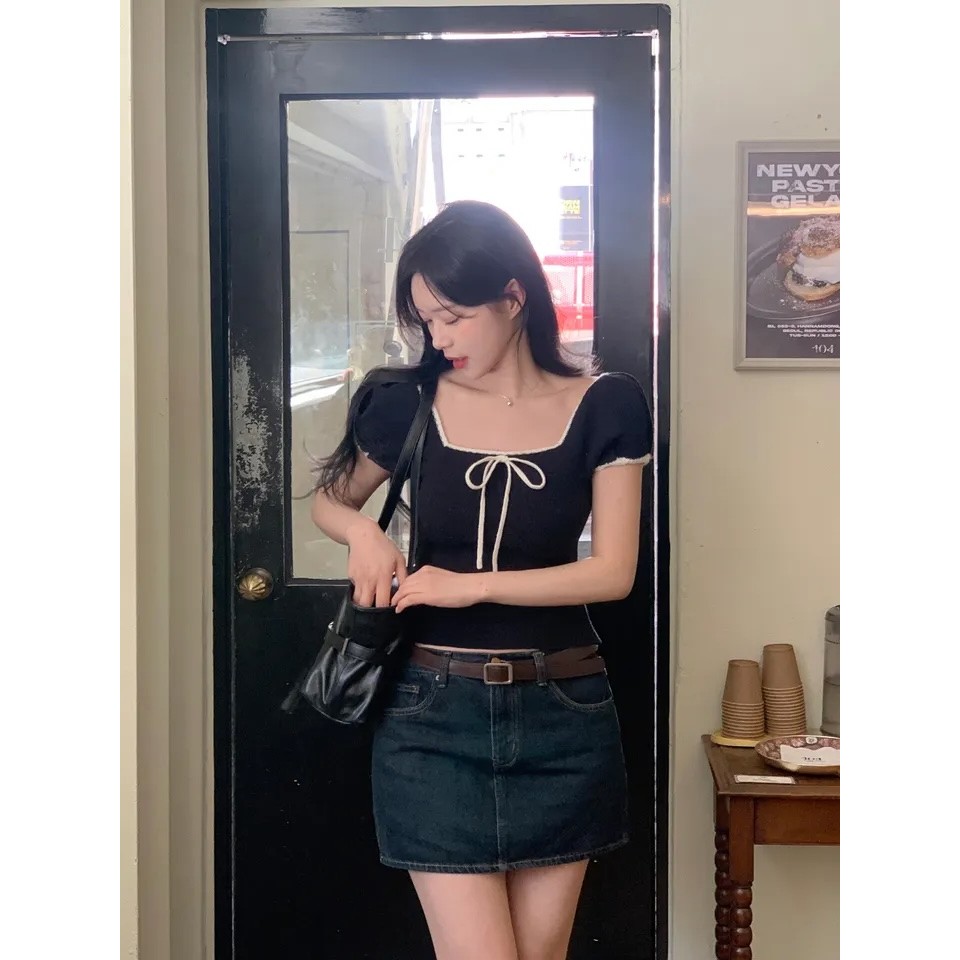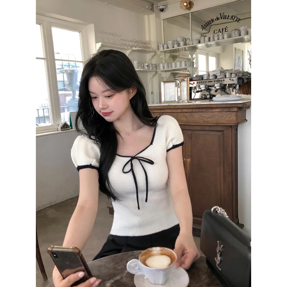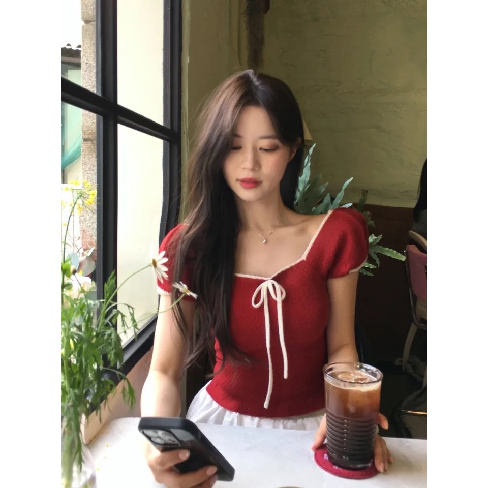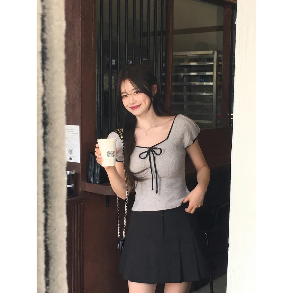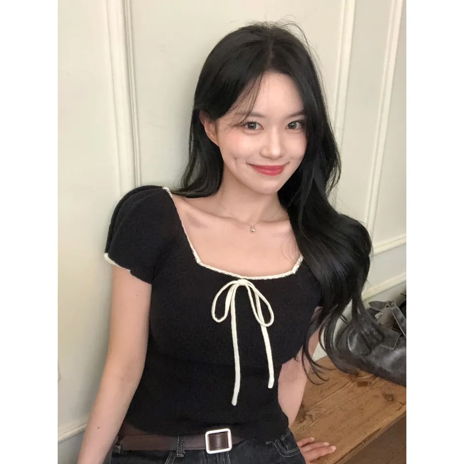 Summer Square-Neck Versatile Bow-Knit Short-Sleeved T-Shirt