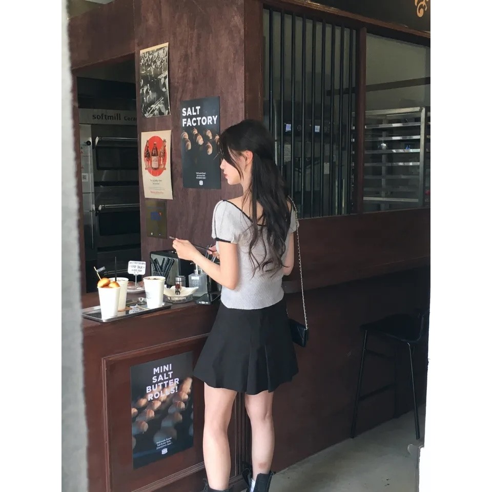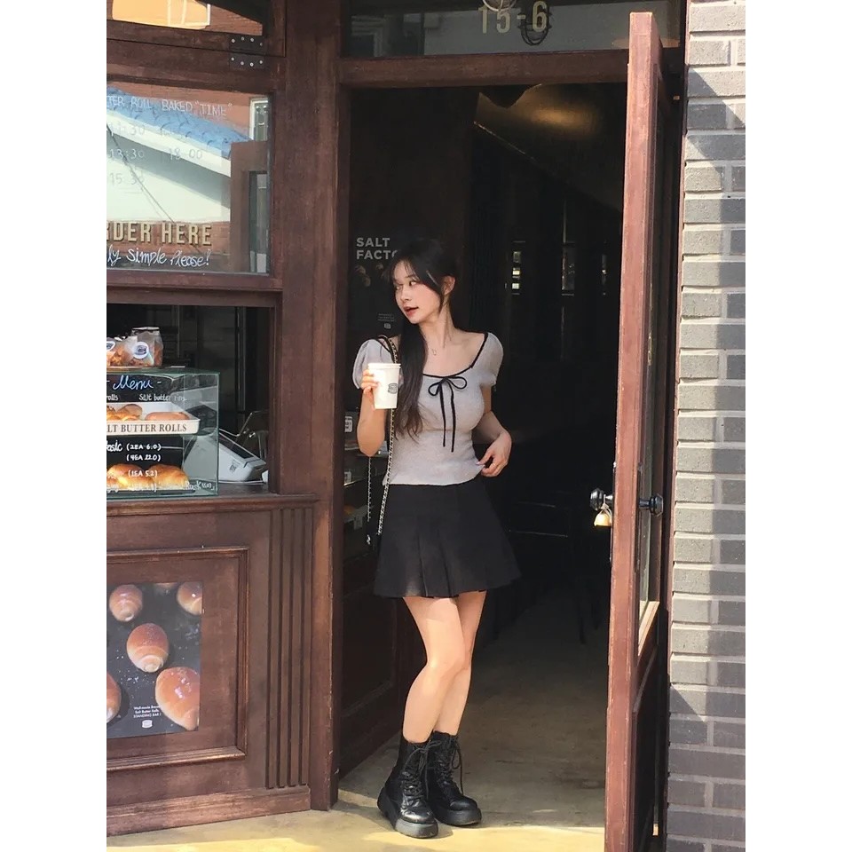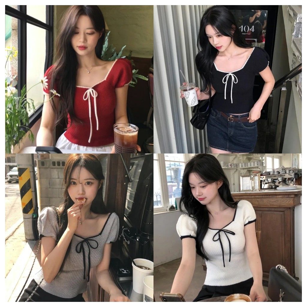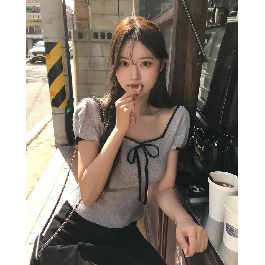 Summer Square-Neck Versatile Bow-Knit Short-Sleeved T-Shirt