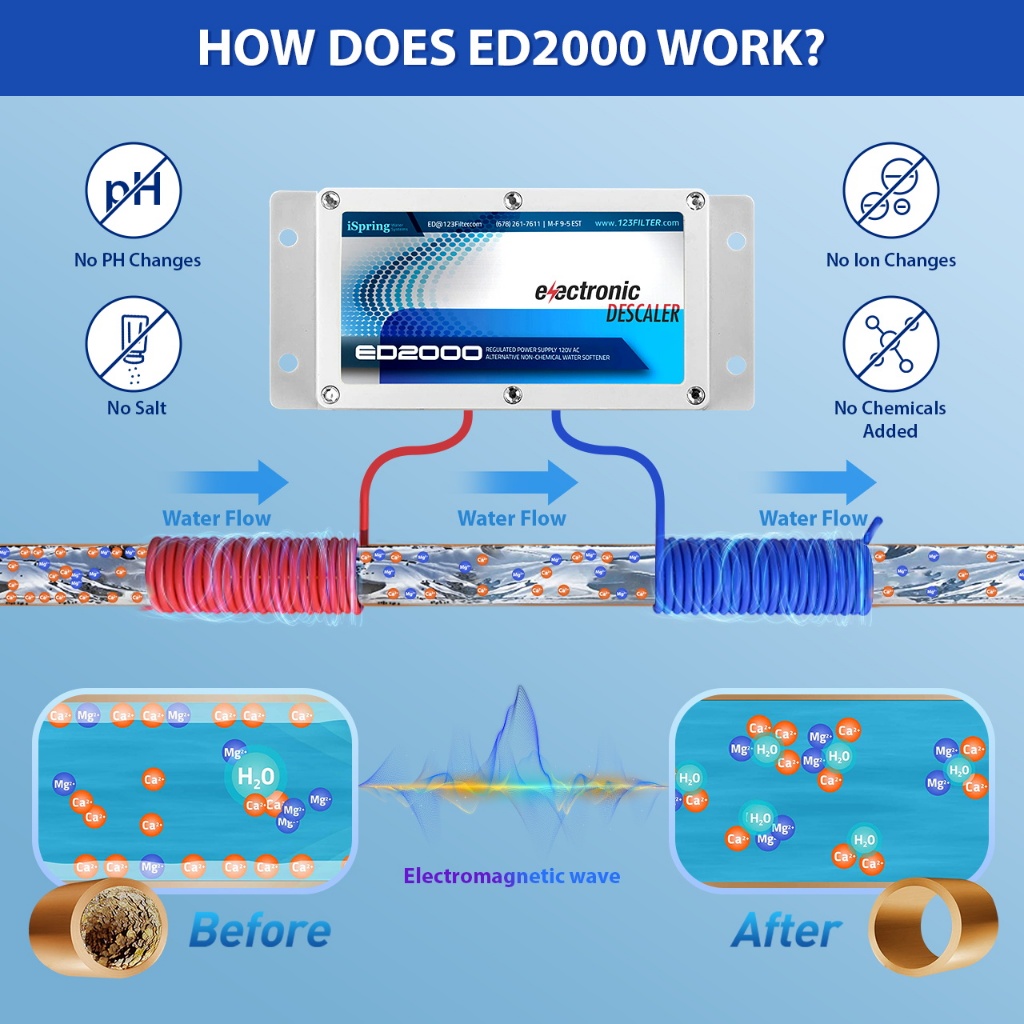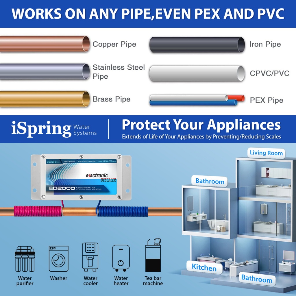 iSpring ED2000 Whole House Water Electronic Descaler Water Conditioner Alternative Electronic Salt-Free Hard Water Conditioner Reduces Limescale Prevent Deposits Build-up