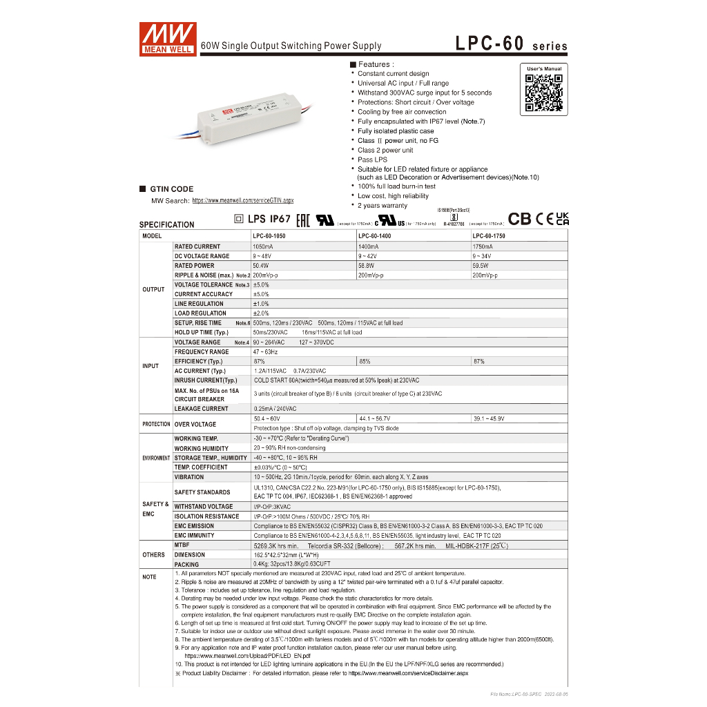 MEAN WELL LPC-60 LPC-60-1050 LPC-60-1400 LPC-60-1750 60W Single Output Switching Power Supply