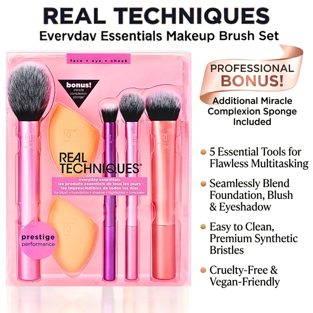 Real Techniques 5pcs Everyday Essentials Makeup Brush Set BLUSH FOUNDATION RT Set Berus Solek