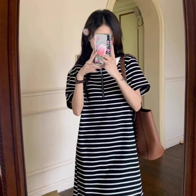 short sleeve polo dress with black and white horizontal stripes, long loose form, simple big size maternity dress, basic T1211G