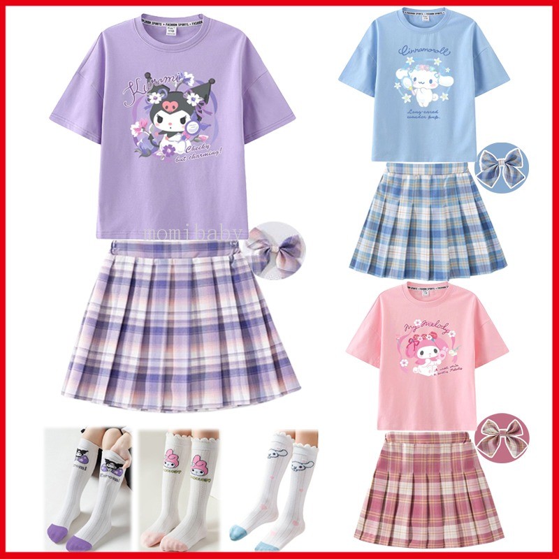 Sanrio Cinnamoroll / Melody / Kuromi T-Shirt + Pleated Skirt for Kids Girl with Bowtie Kids Birthday Clothing Cute Cartoon Top JK Plaid Skirts Kuromi Dress for Kids Girl Terno