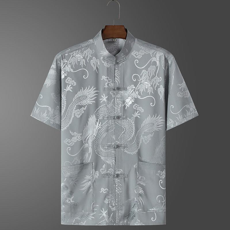 Men's short-sleeved shirt in ice silk style, casual Chinese plus size Hanfu, sleeves decorated with elegant dragon patte