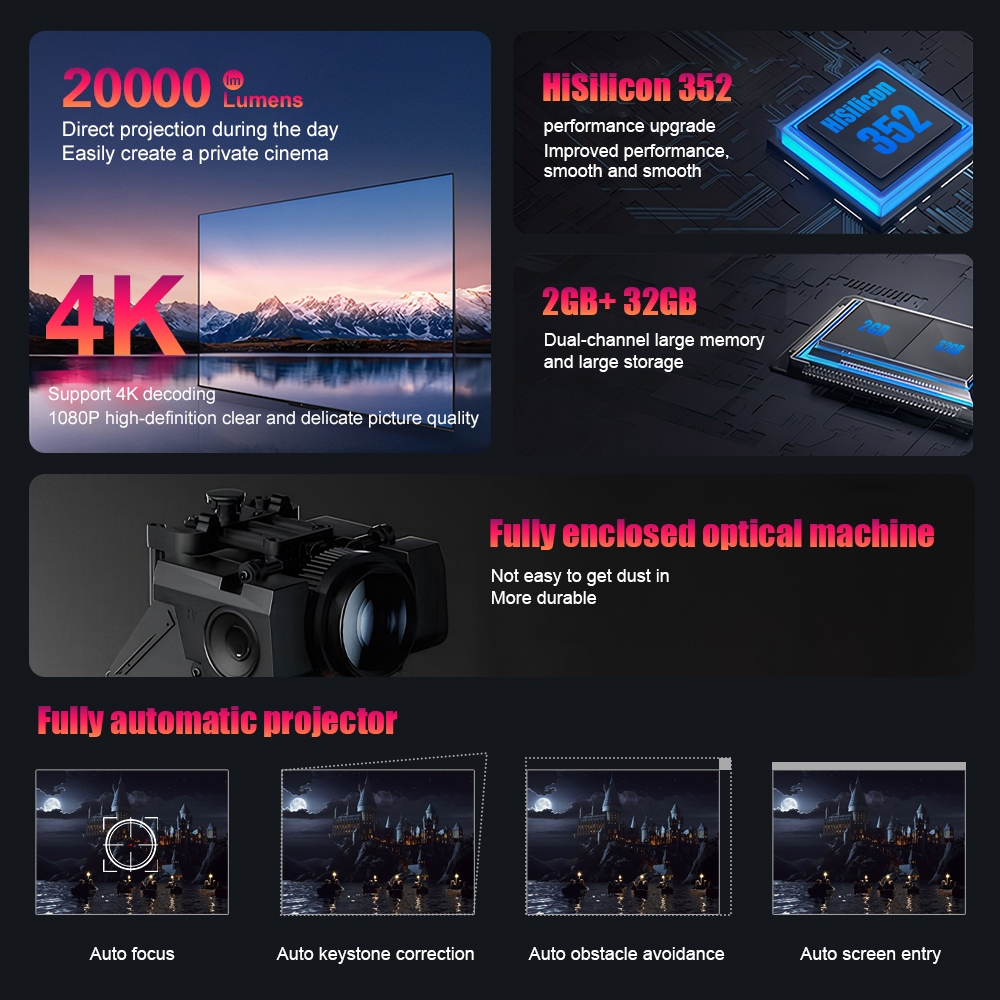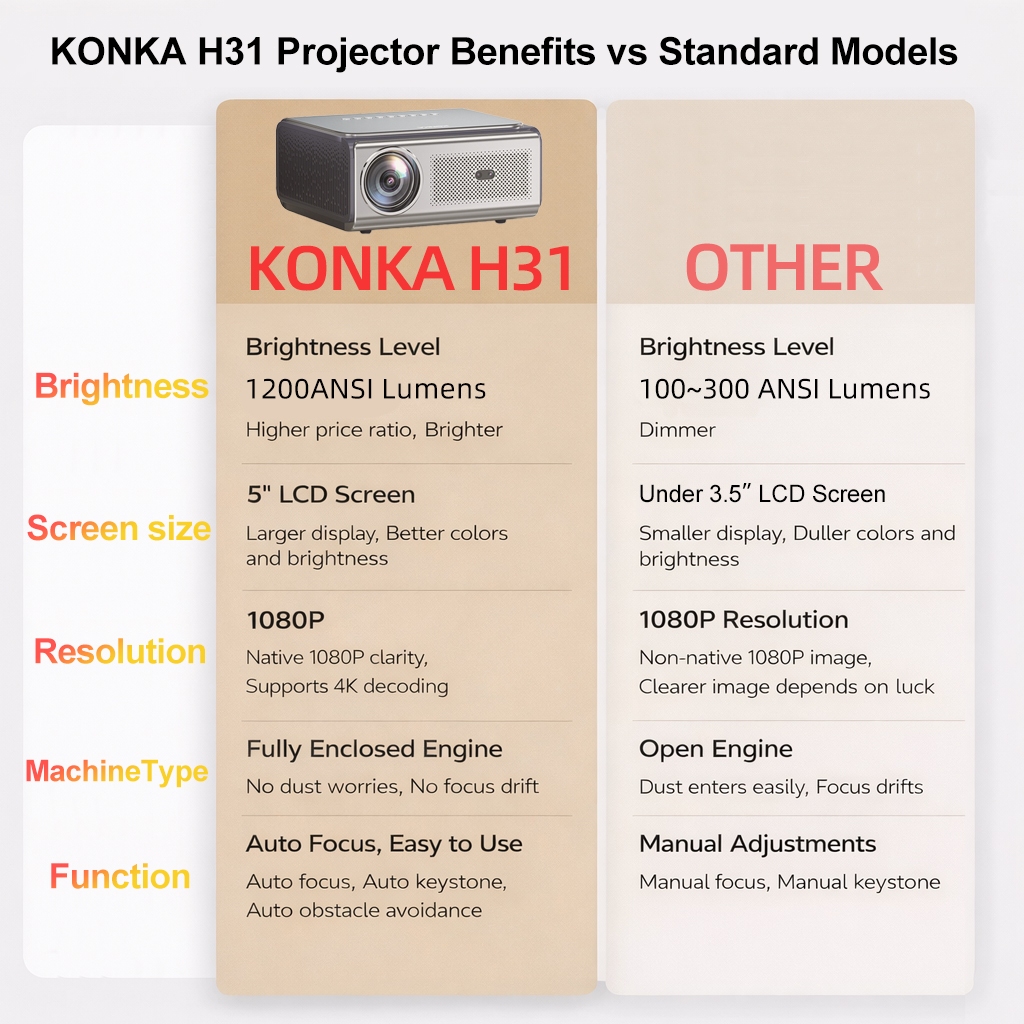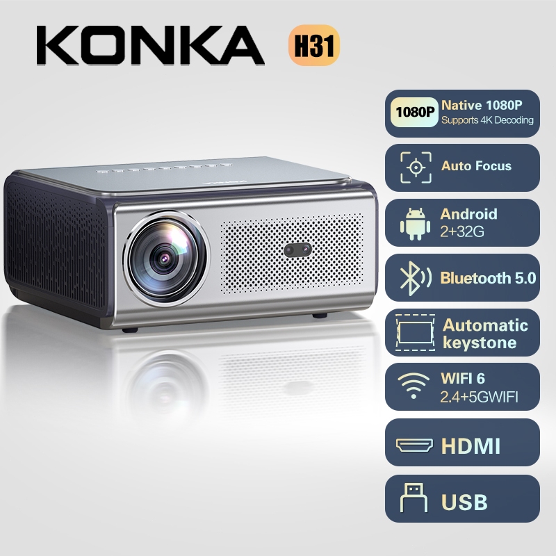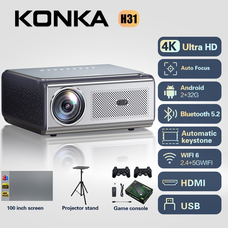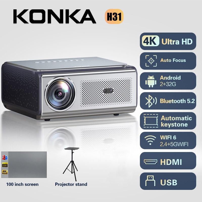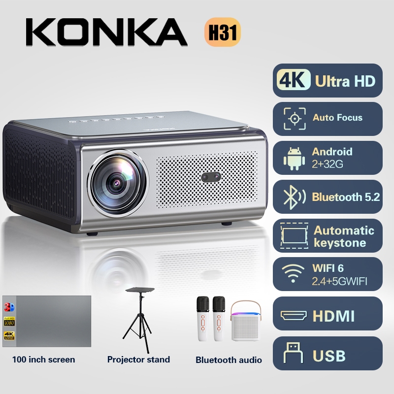 【Konka】H31 4K Projector 1200 ANSI Lumens Ultra Bright Projector For Daytime use 1200ANSI High Brightness Smart Projector with Autofocus Dual-Band WiFi and Bluetooth for Classroom and Home Theater
