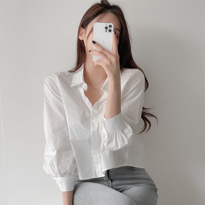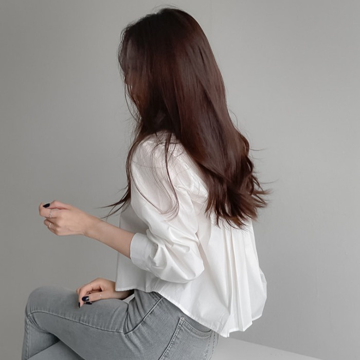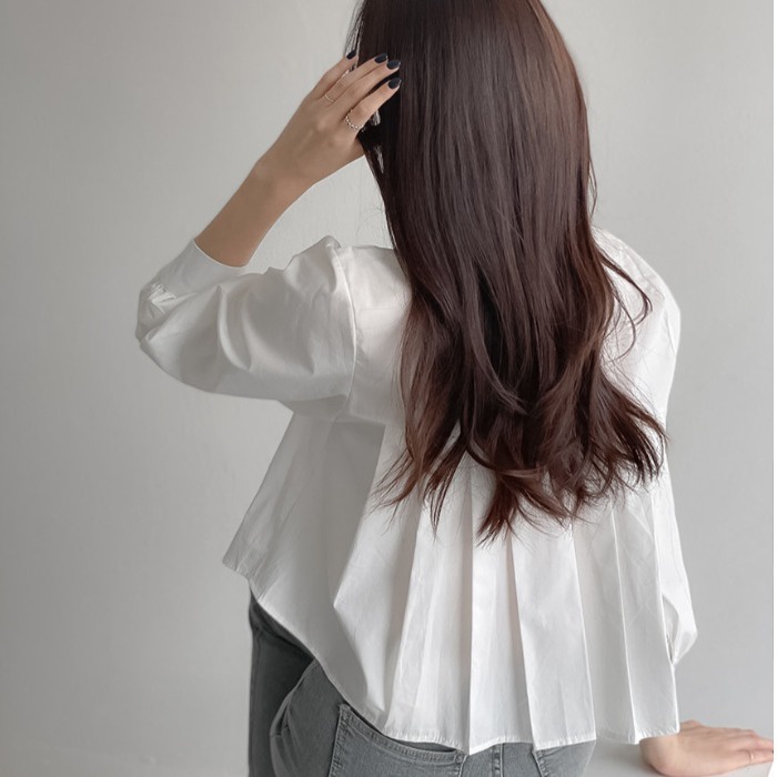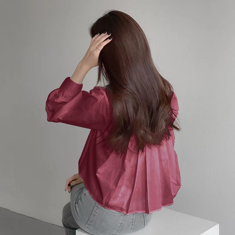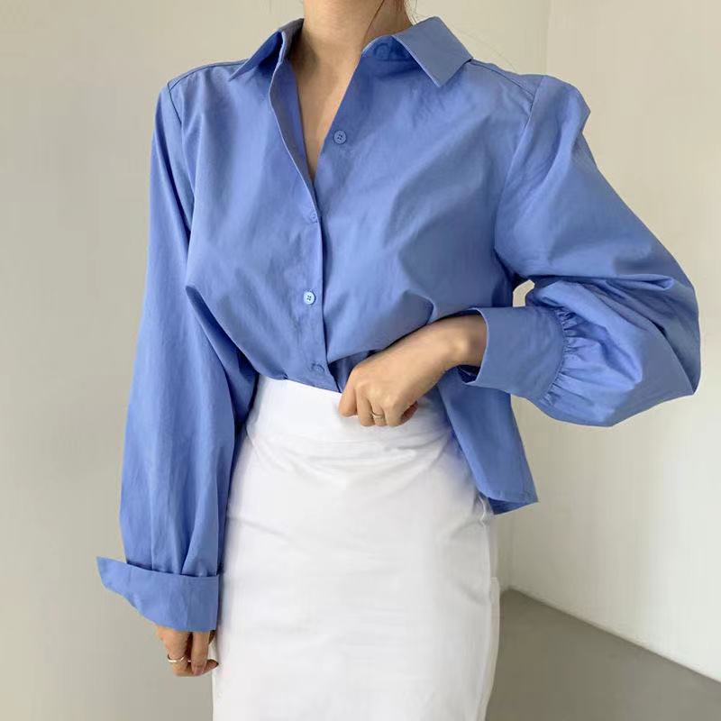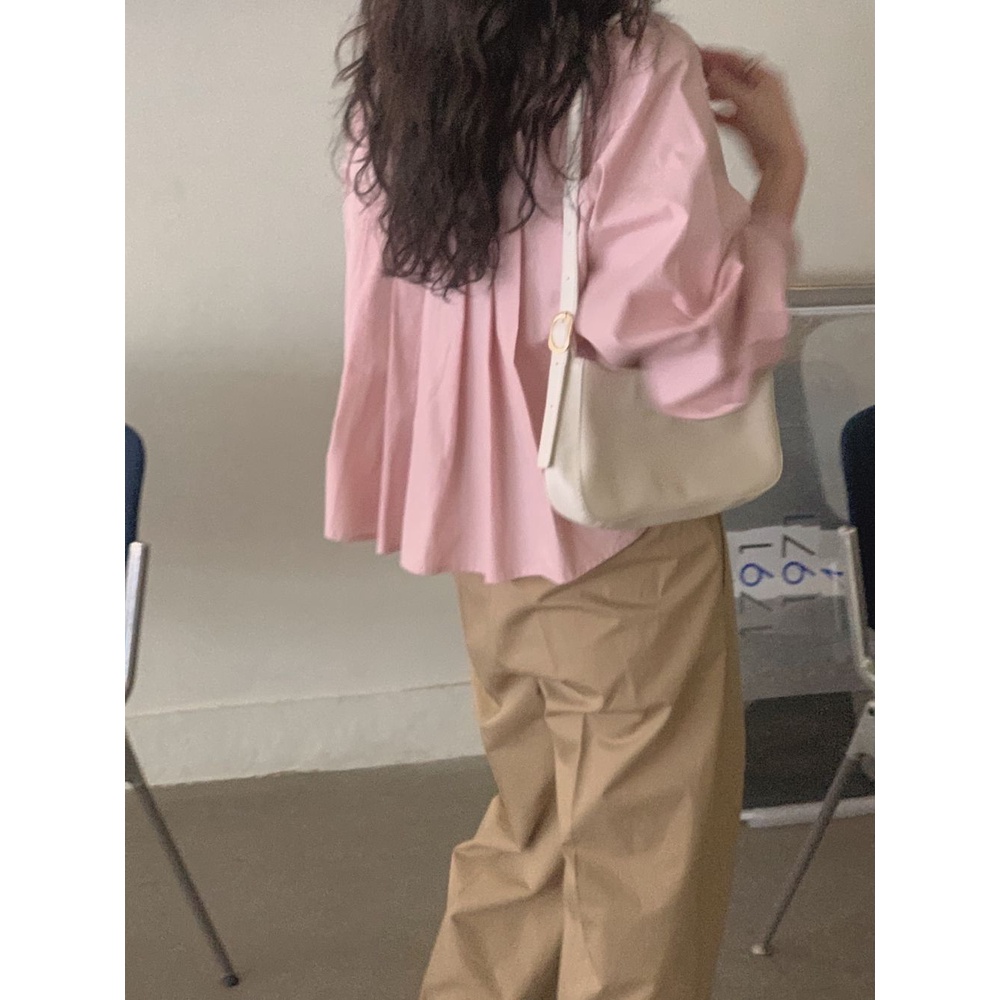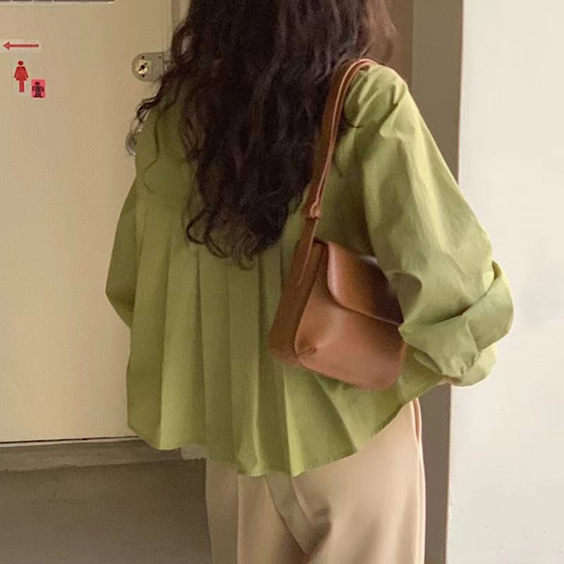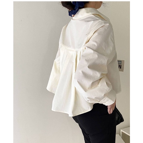 Korea Women Fashion Long Sleeve Lapel Collar Loose Pleated Blouse