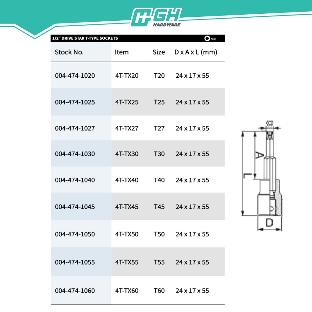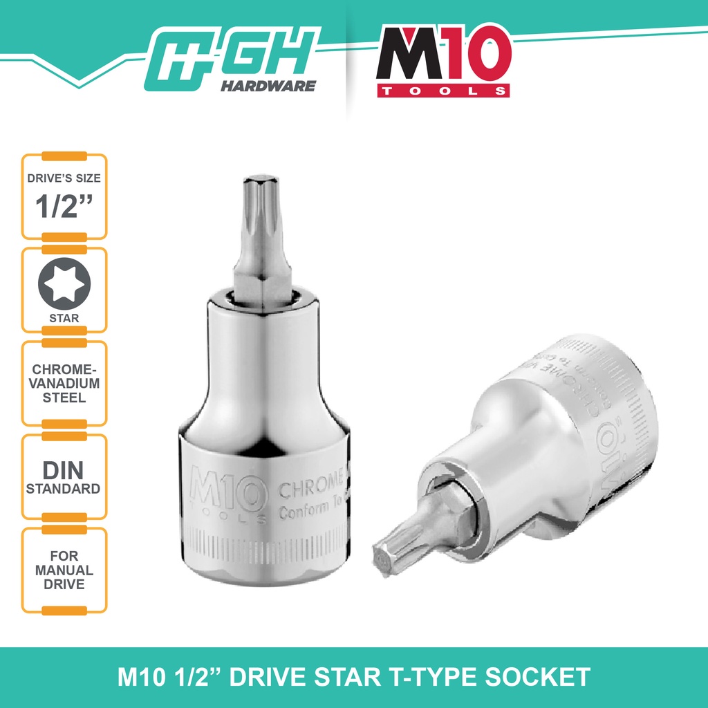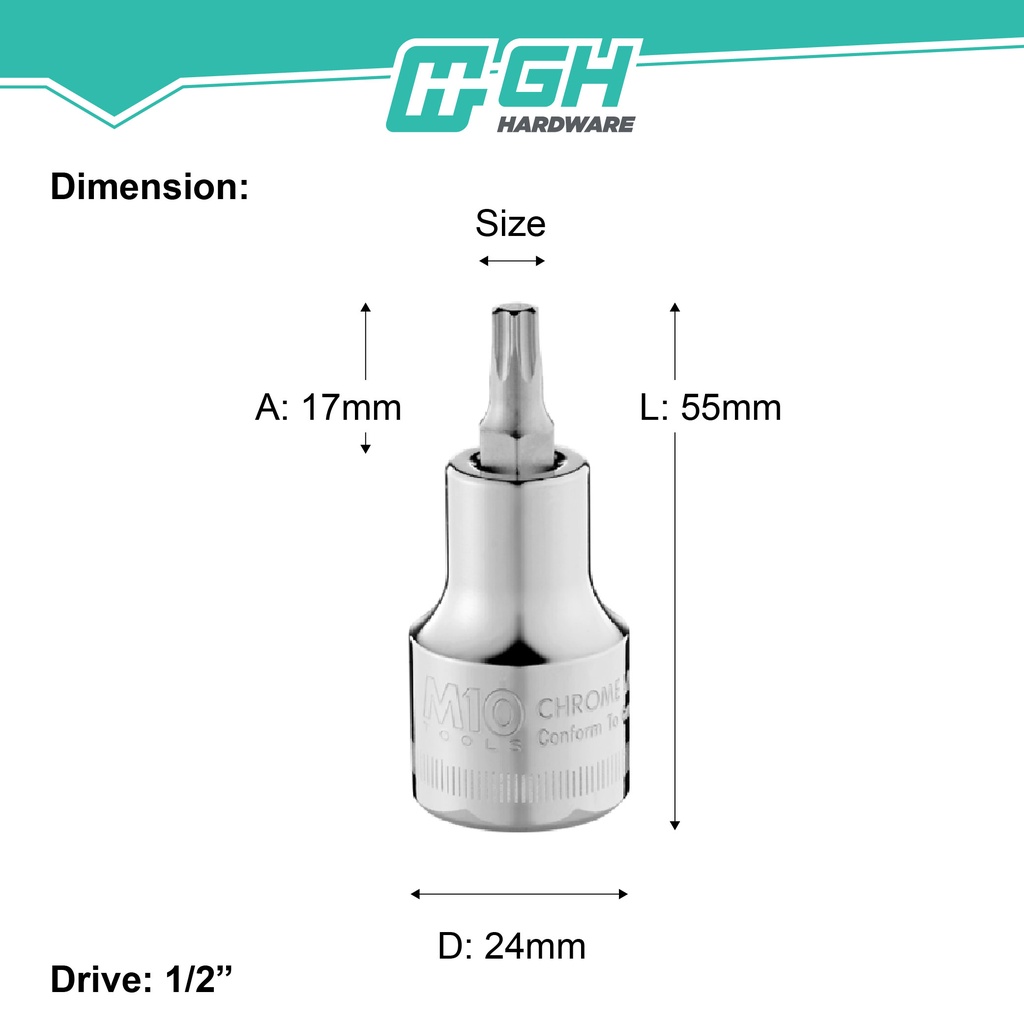 [ GH HARDWARE ] M10 1/2" Drive Star T Type Socket - T20 / T25 / T27 / T30 / T40 / T45 / T50 / T55 / T60
