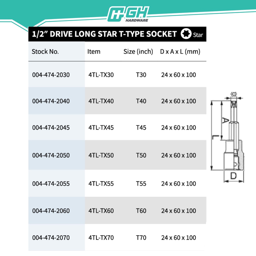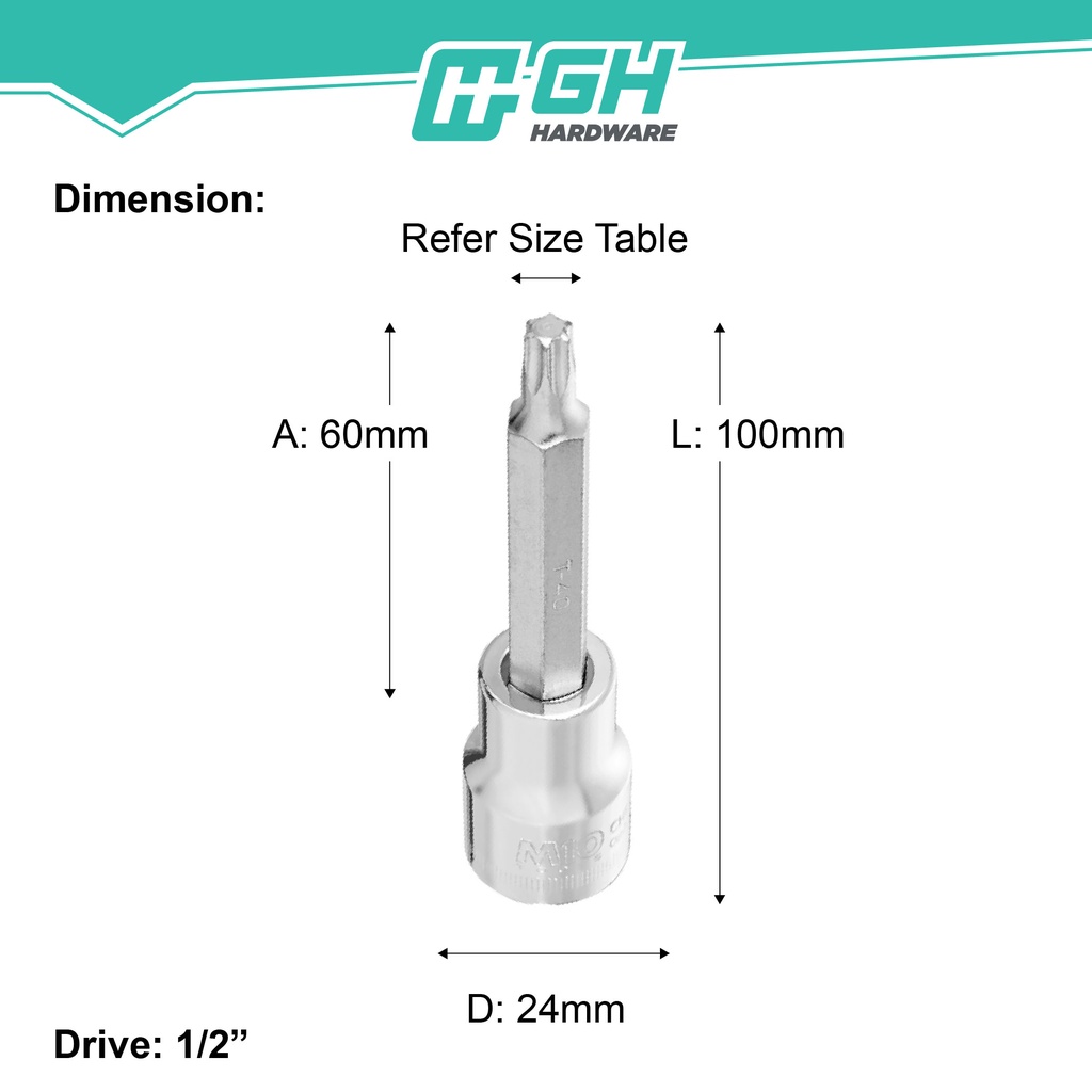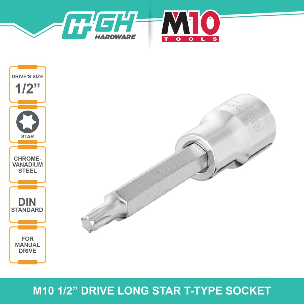 [ GH HARDWARE ] M10 1/2" Drive Long Star T Type Socket - T30 / T40 / T45 / T45 / T50 / T55 / T60 / T70