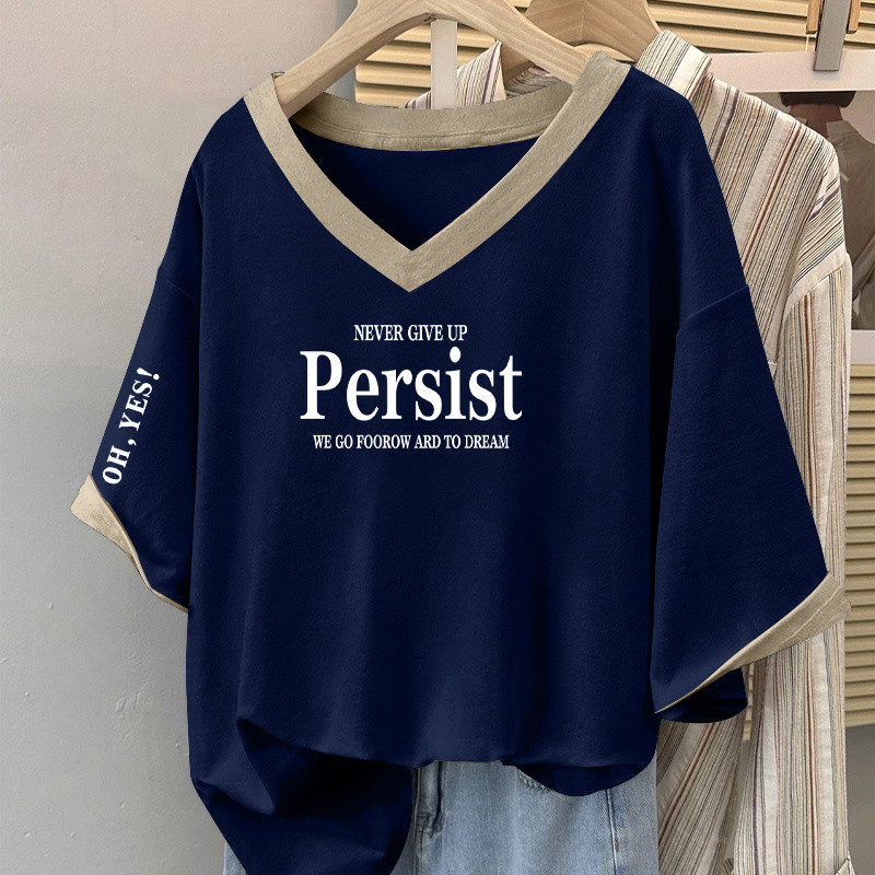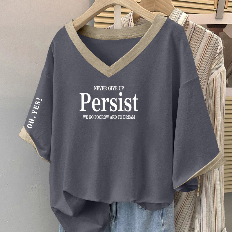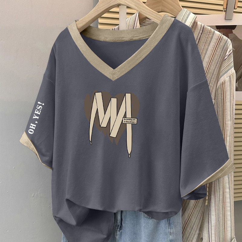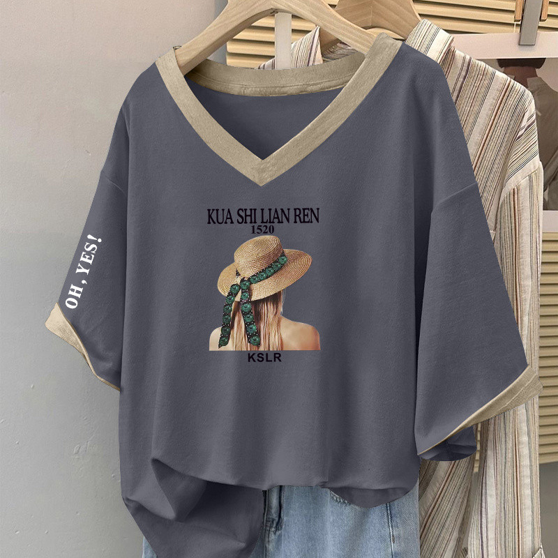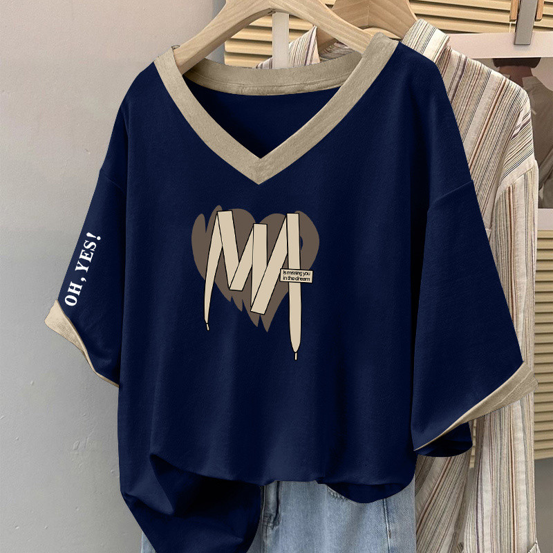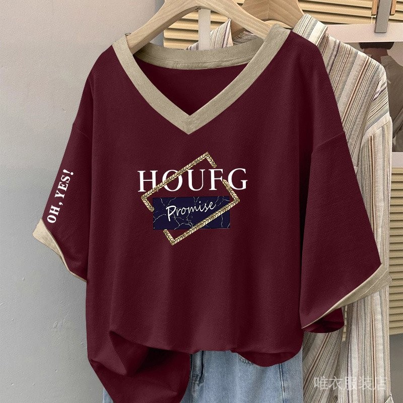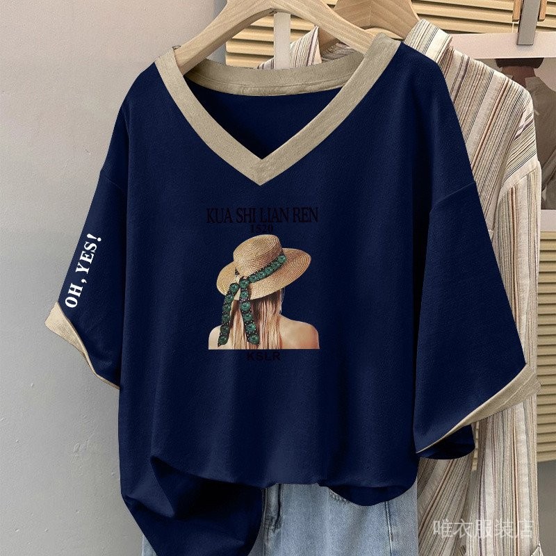 V-NECK T-SHIRT V领T恤 女士 上衣 大码v领短袖T恤女士时尚拼色百搭上衣宽松显瘦遮肚子体恤衫