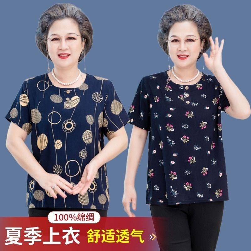 old women shirt奶奶100%绵绸t恤女装中老年女宽松人造棉薄款碎花印花上衣Grandma 100% silk T-shirt dress middle-aged and2.11