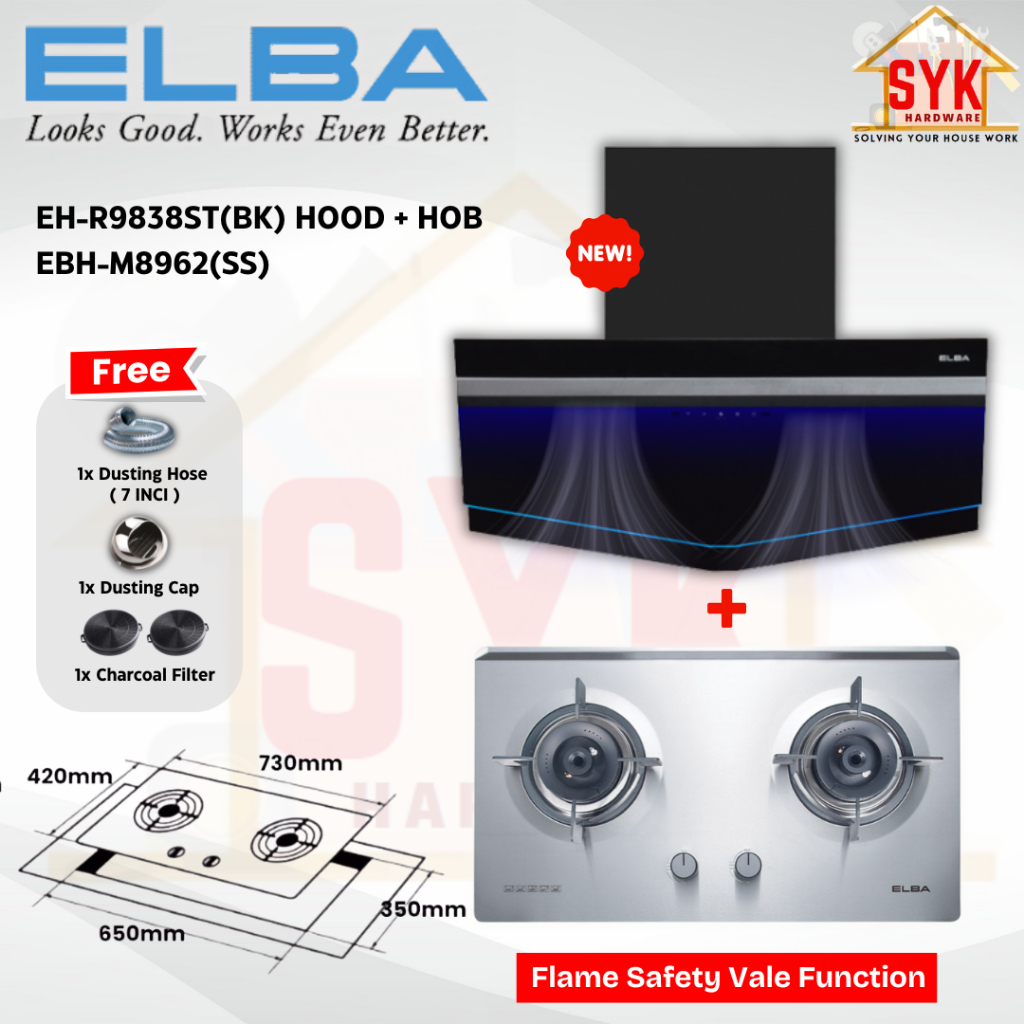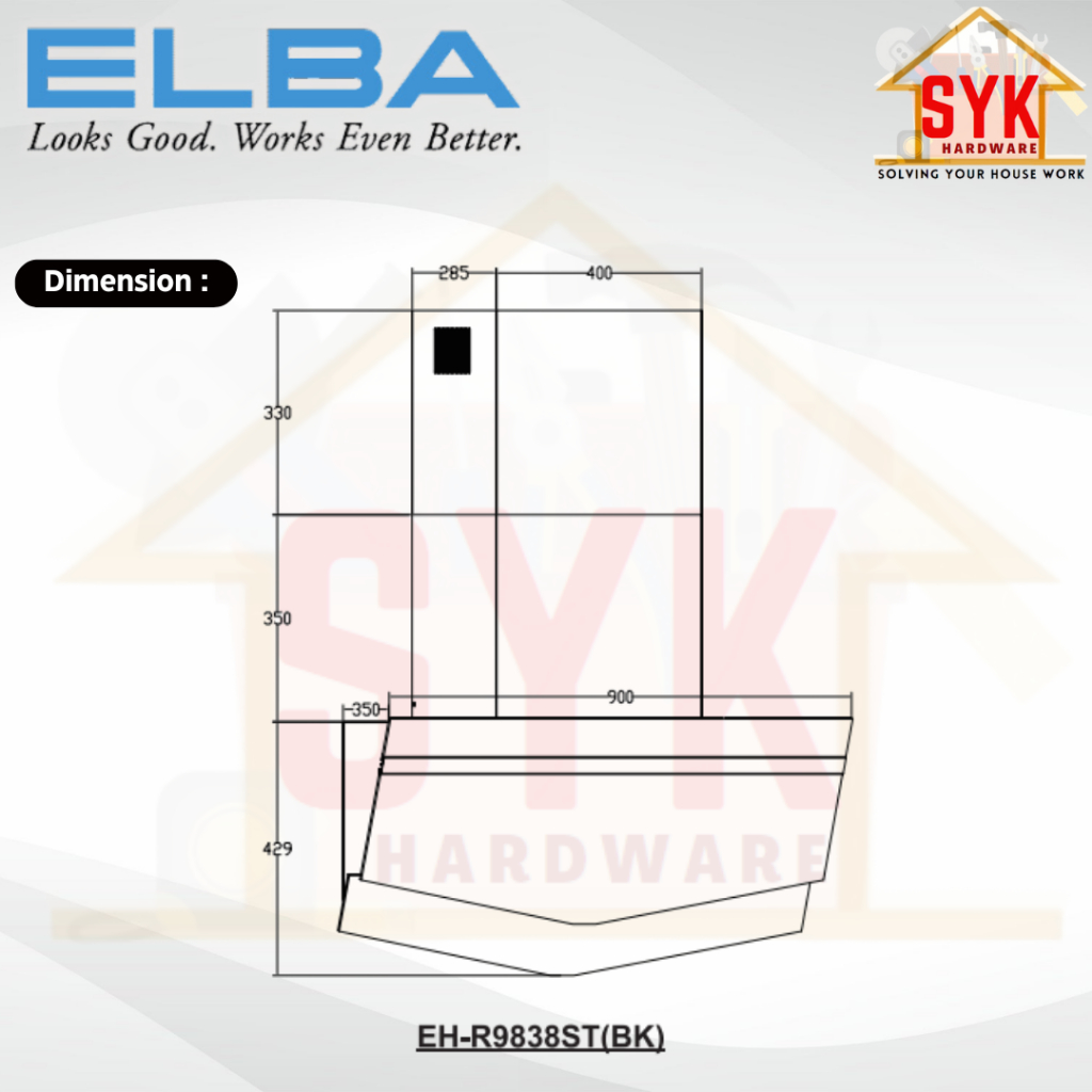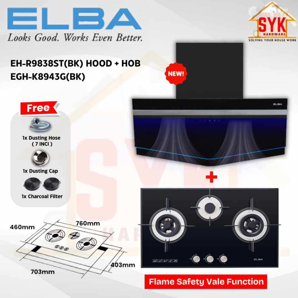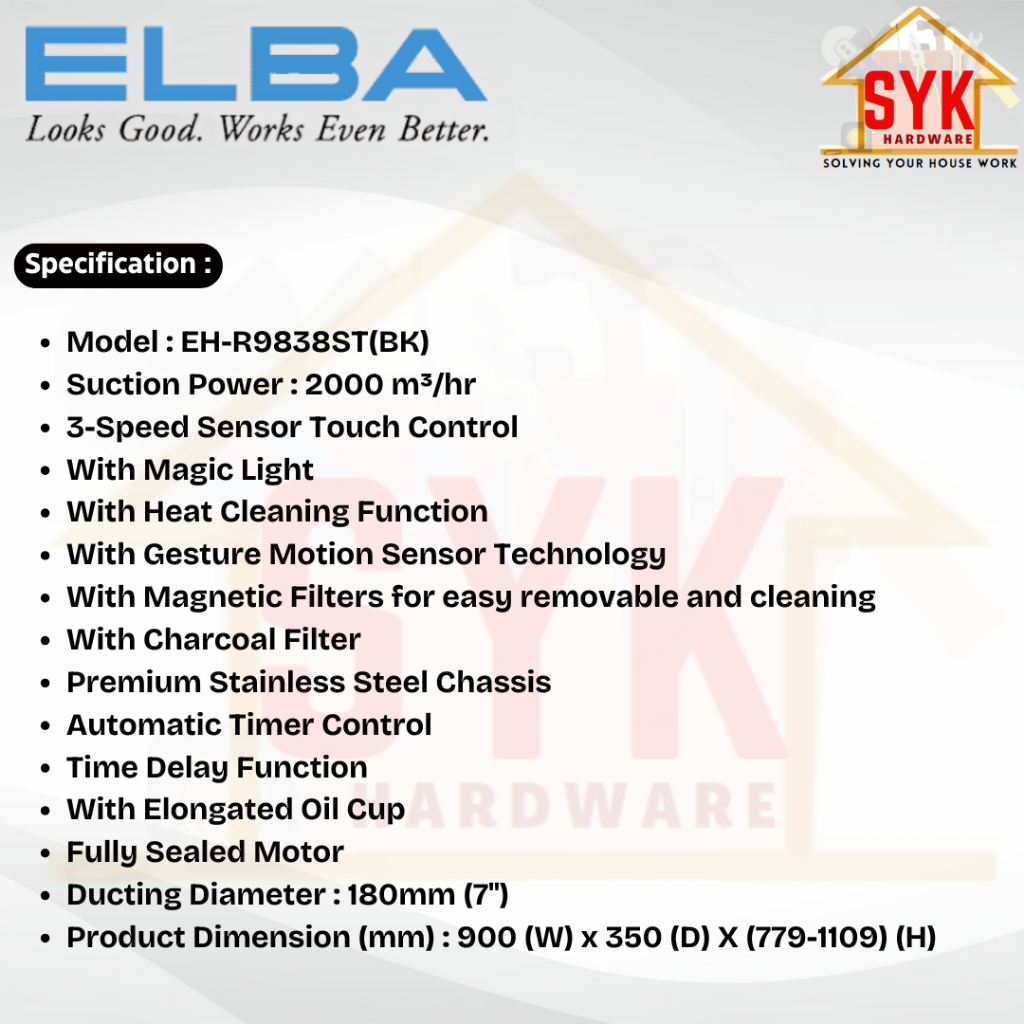 SYK Free Shipping ELBA EH-R9838ST(BK) Cooking Cooker Hood Kitchen Penyedut Asap Dapur Masak Free Gift