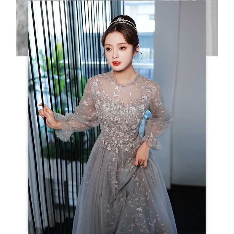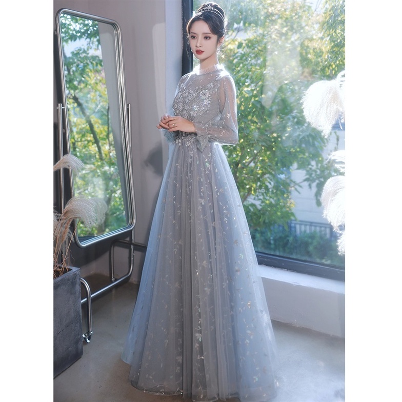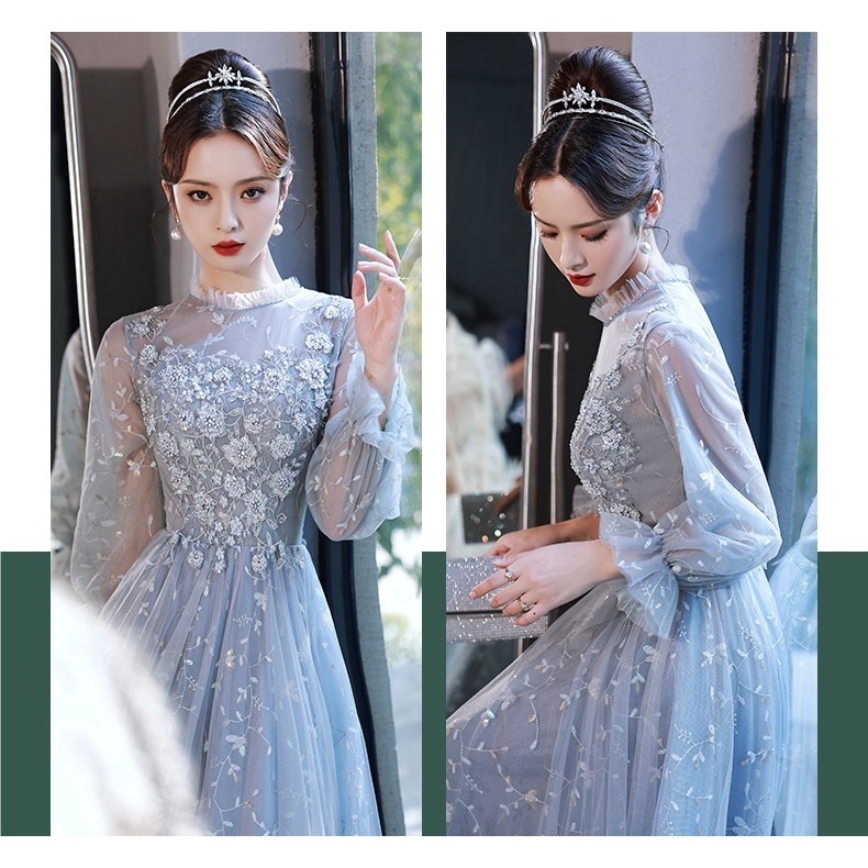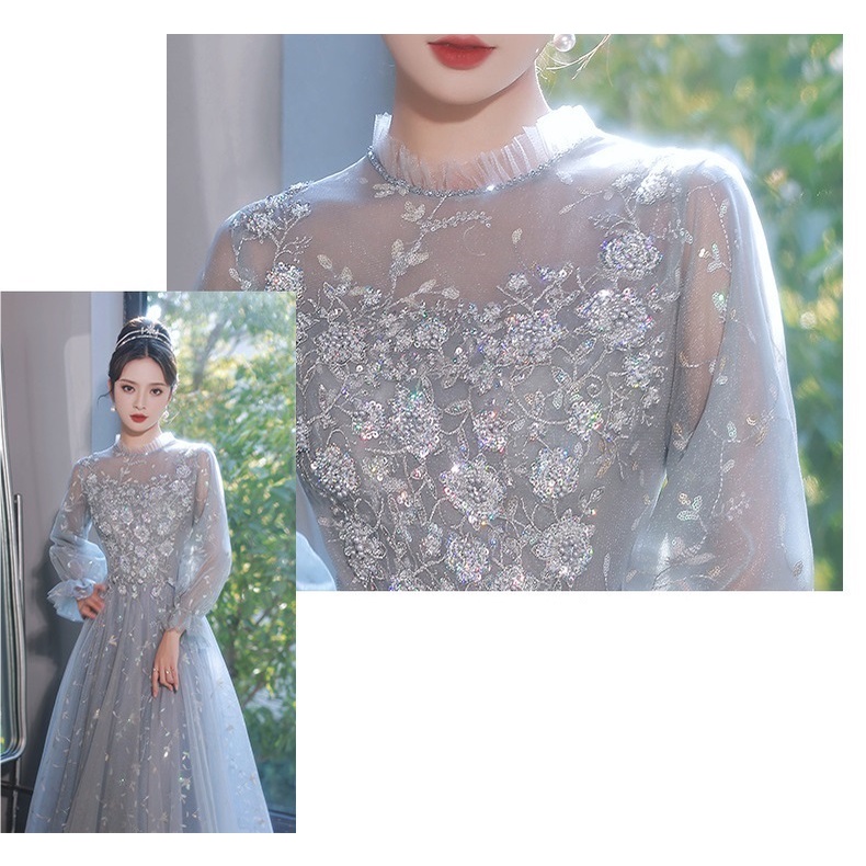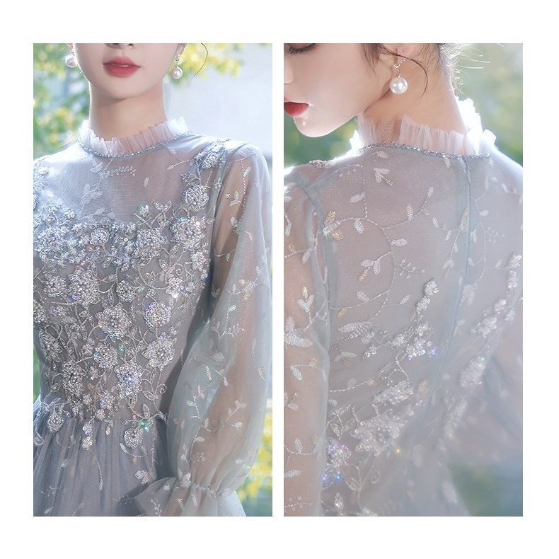 Elegant Evening Dress Long Sleeve Flower Embroidery Slim A-line Dresses Banquet Fairy Birthday Party Annual Dinner Gown