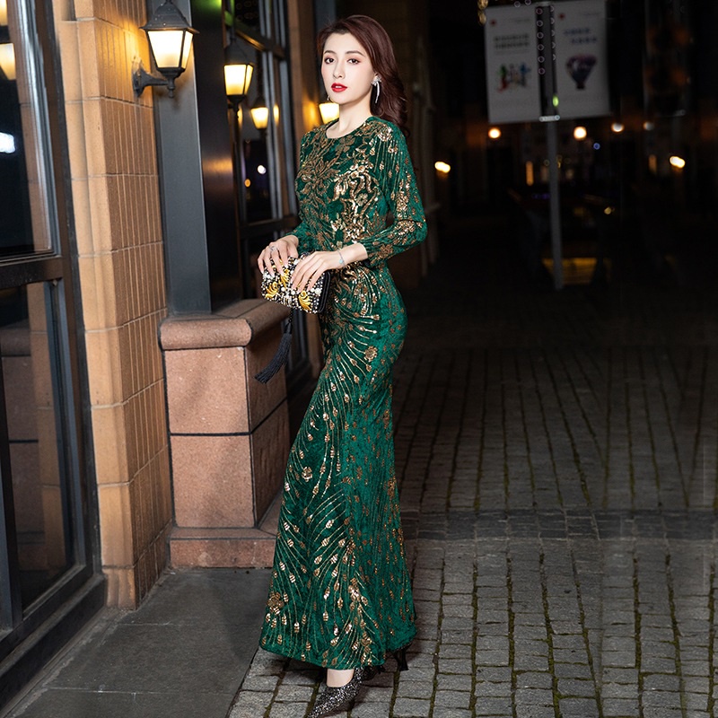 Green Velvet Glitter Evening Dress Temperament Long-sleeved Round Neck Slim Fishtail Dresses Annual Dinner Wedding Banquet Long Party Gown