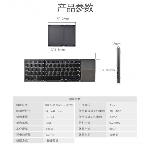Foldable Bluetooth Keyboard QWERTY Touchpad USB Charging Wireless Portable Phone Tablet
