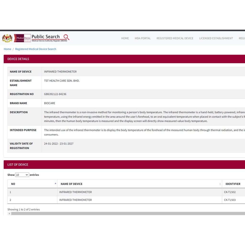 (MDA Approved) BioCare Infrared Thermometer (CK-T1502)