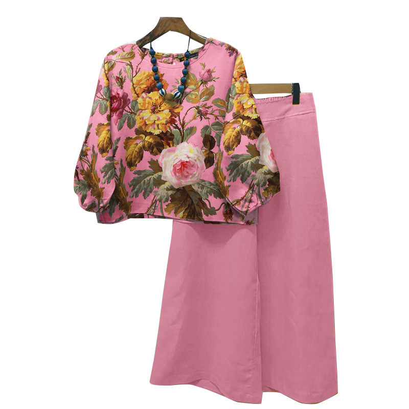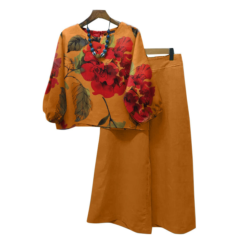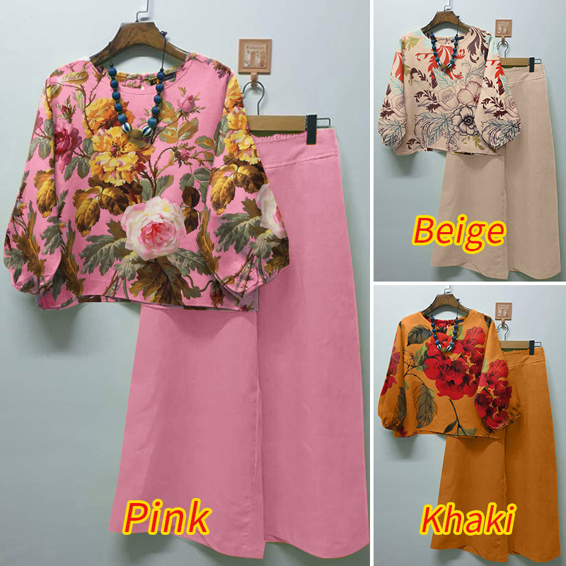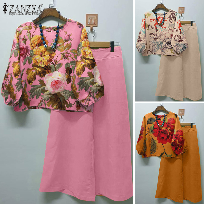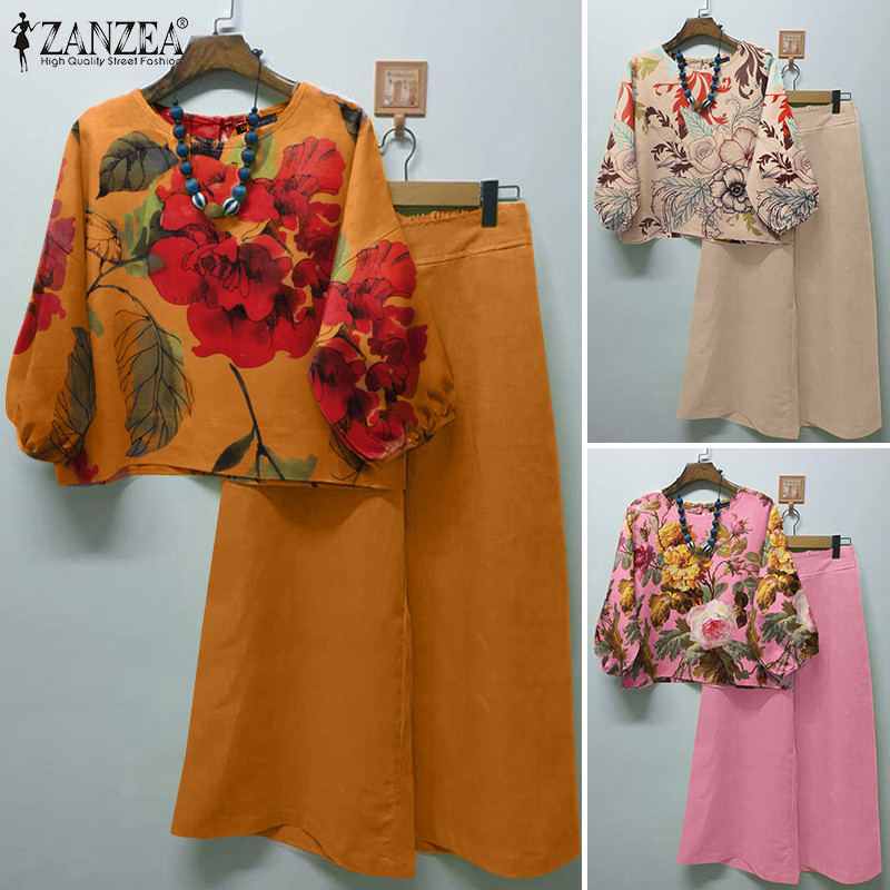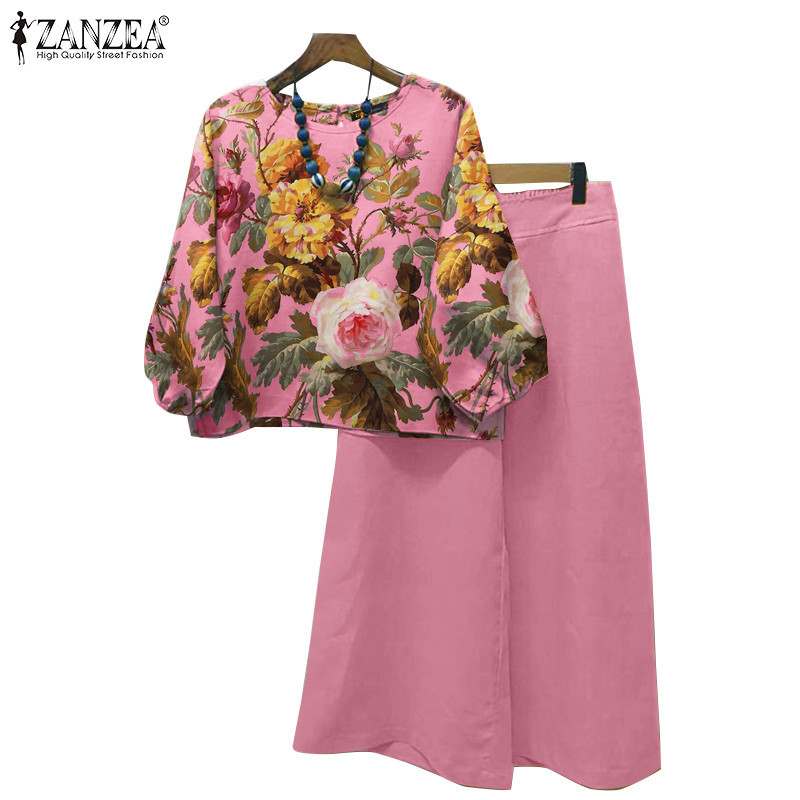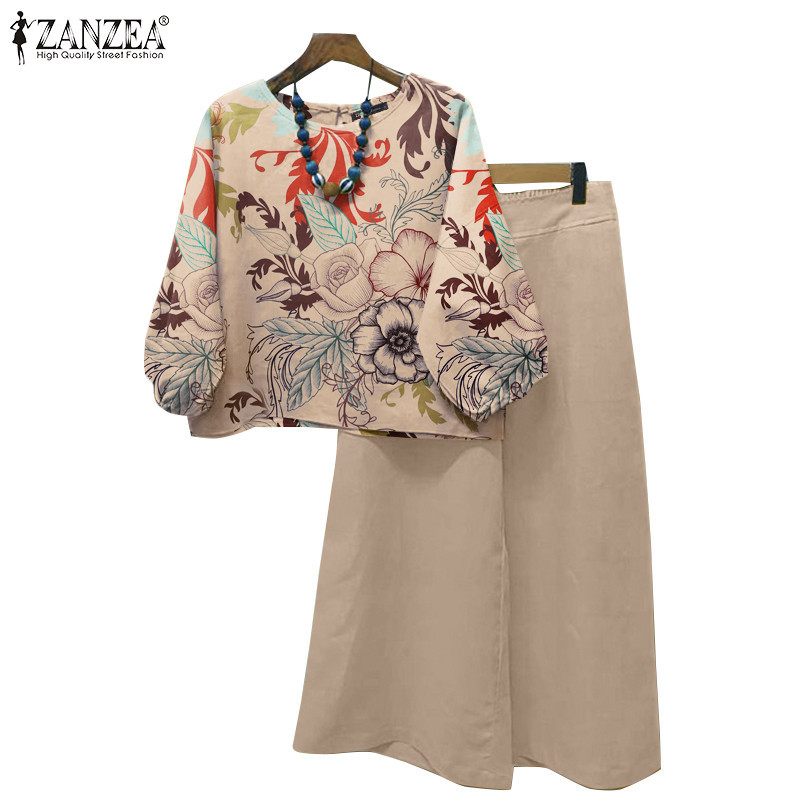 ZANZEA Celmia Women Printing Lantern Sleeve O Neck Cuffs Elasticized Tops + Trousers Sets