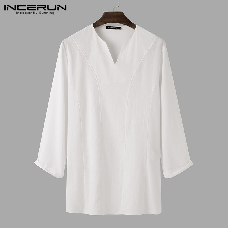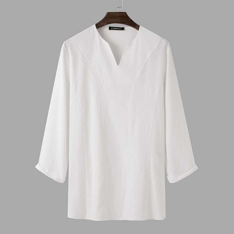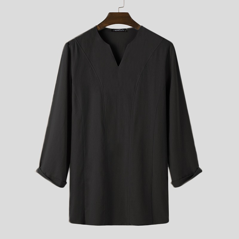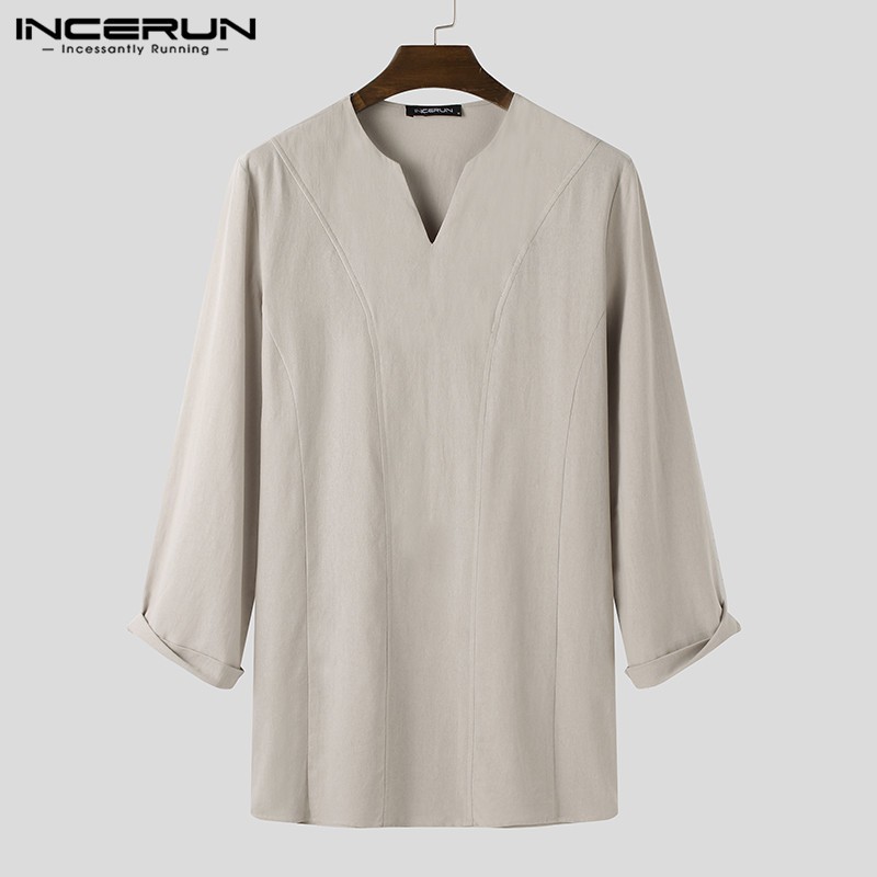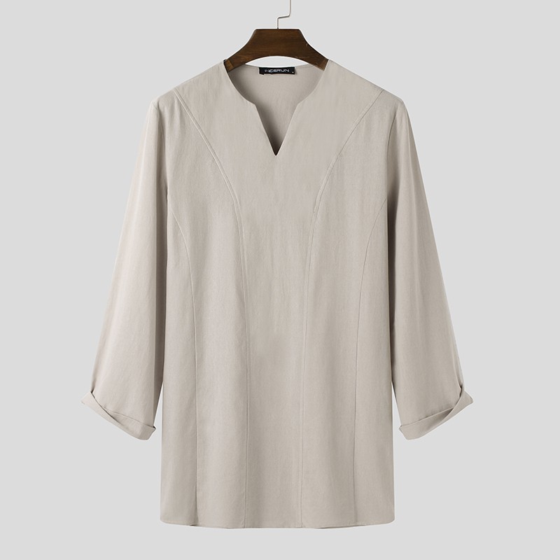 INCERUN Men Simple Casual Cotton Long Sleeve V-neck Loose T-shirt