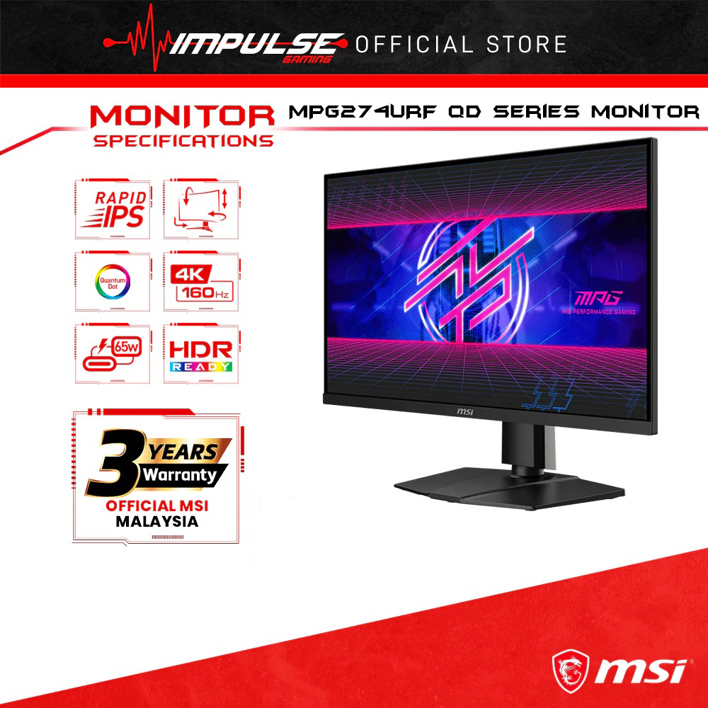 MSI MPG274URF-QD UHD 27-inch Gaming Monitor - 3840x2160(UHD), Rapid IPS, 160hz, 0.5ms GTG, DisplayHDR 400, Type-C Port