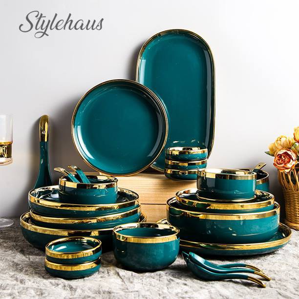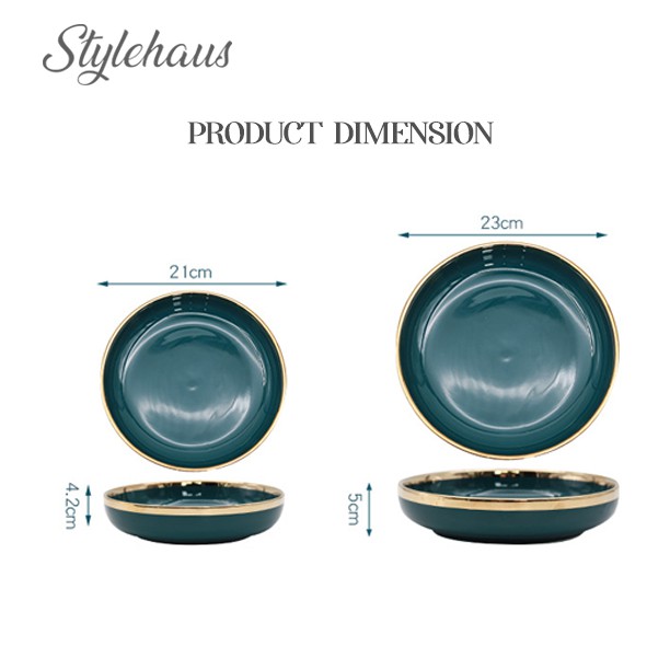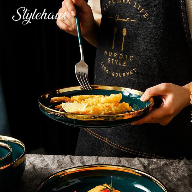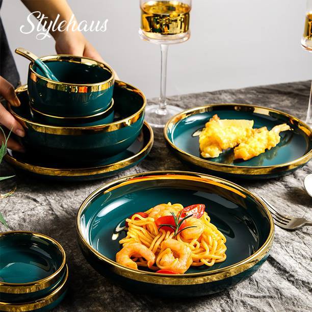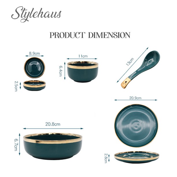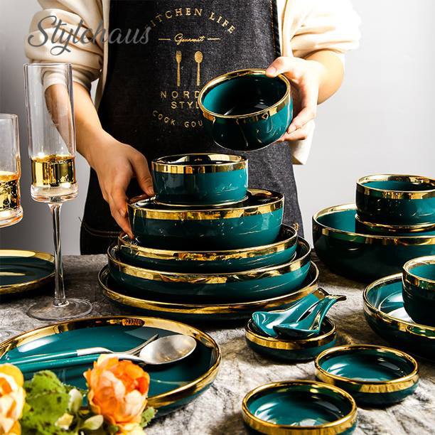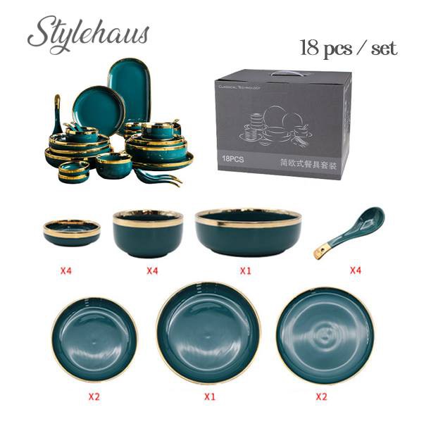 18 PIECES Premium Emerald Green Gold Line Dinner Set Plates and Bowls