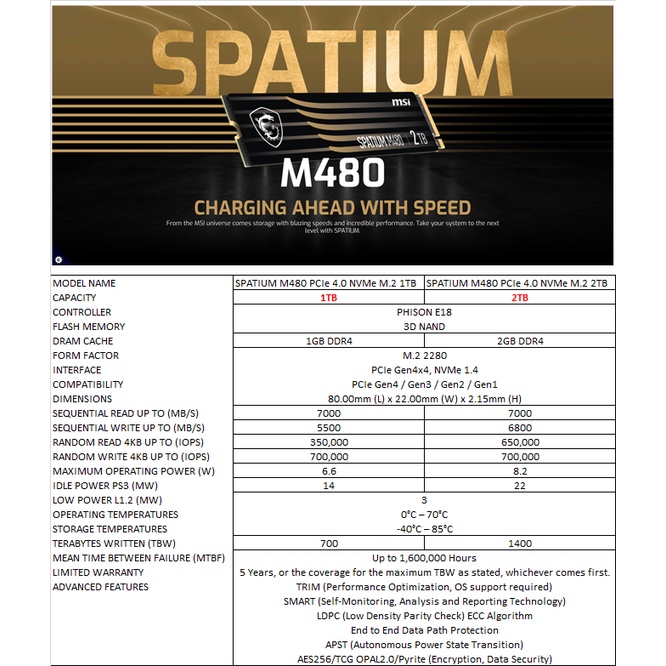 MSI SPATIUM M461 PCIe 4.0 NVMe M.2 SSD - 2TB