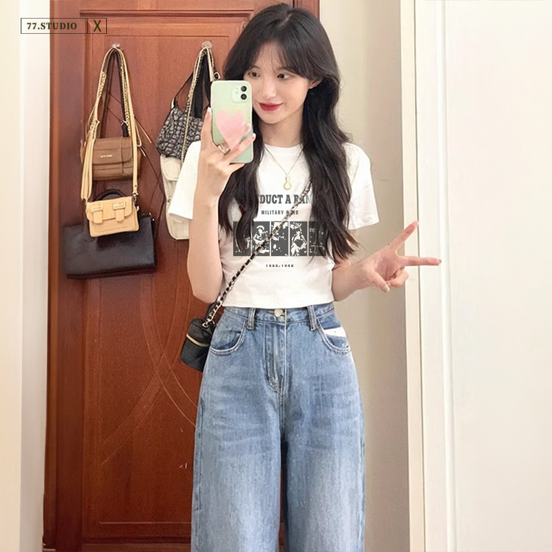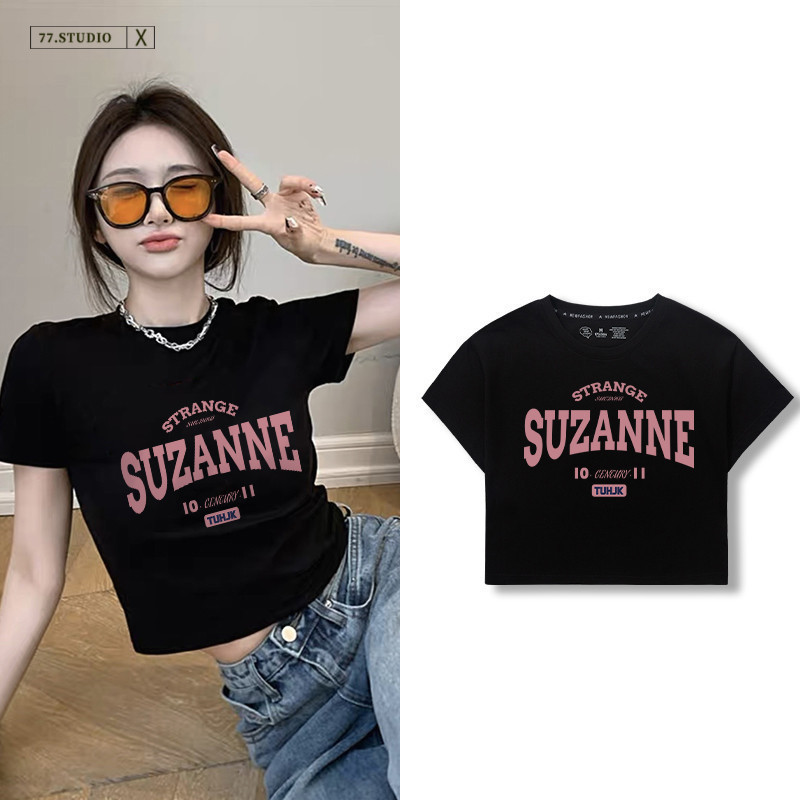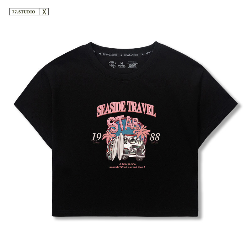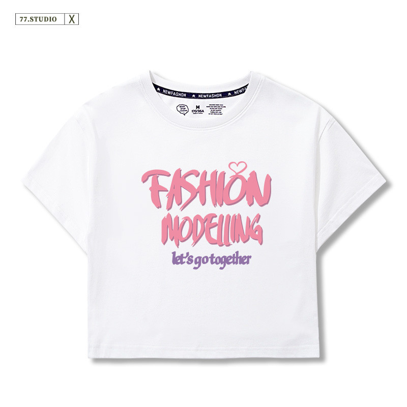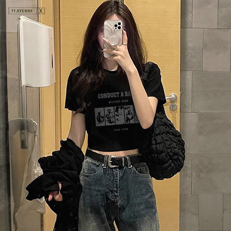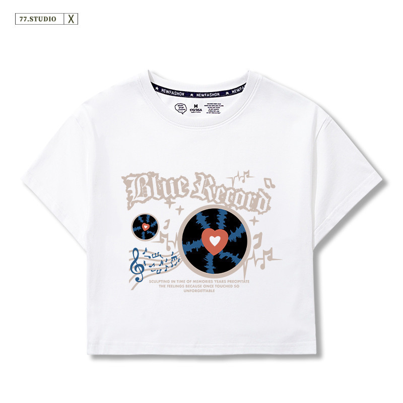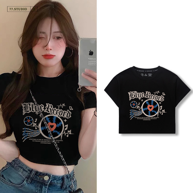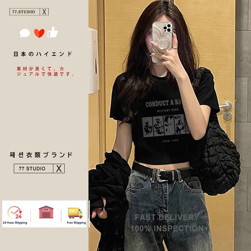 (Ready to ship) Short top, soft and comfortable. #Printed short-sleeved 100% cotton T-shirt, women's belly-baring top
