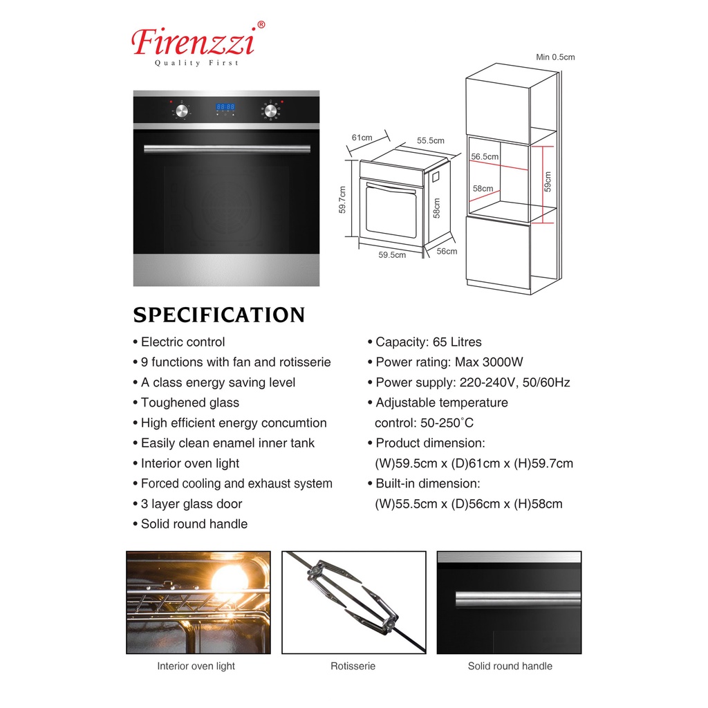 Firenzzi 72L / 65L Built-In Oven FBO-7268 FBO-6068 with Sensor Touch & Mechanical Control Digital Display