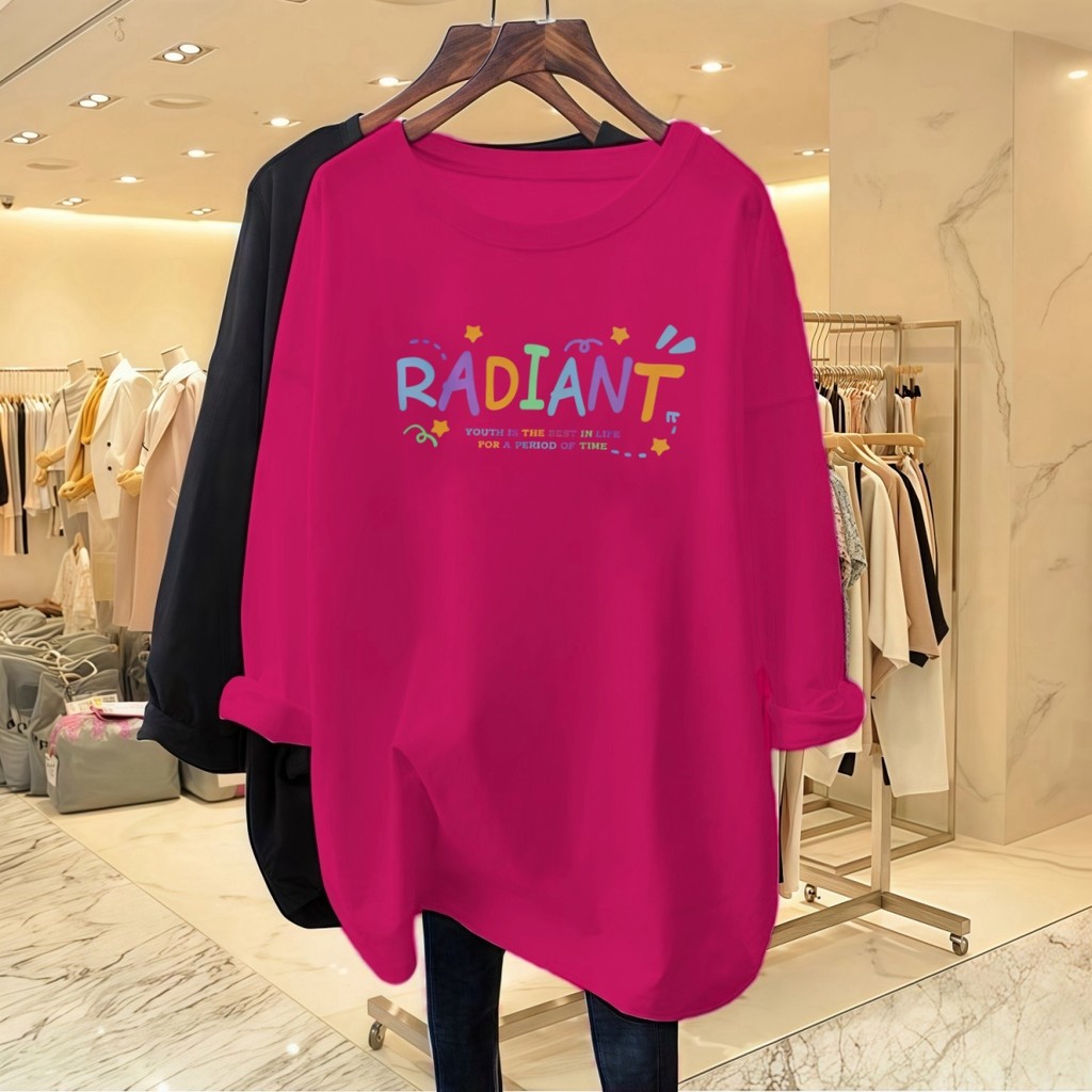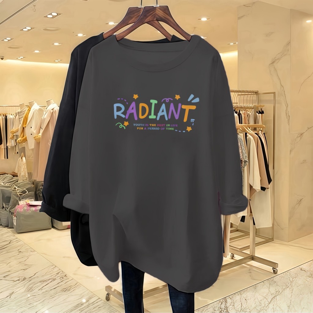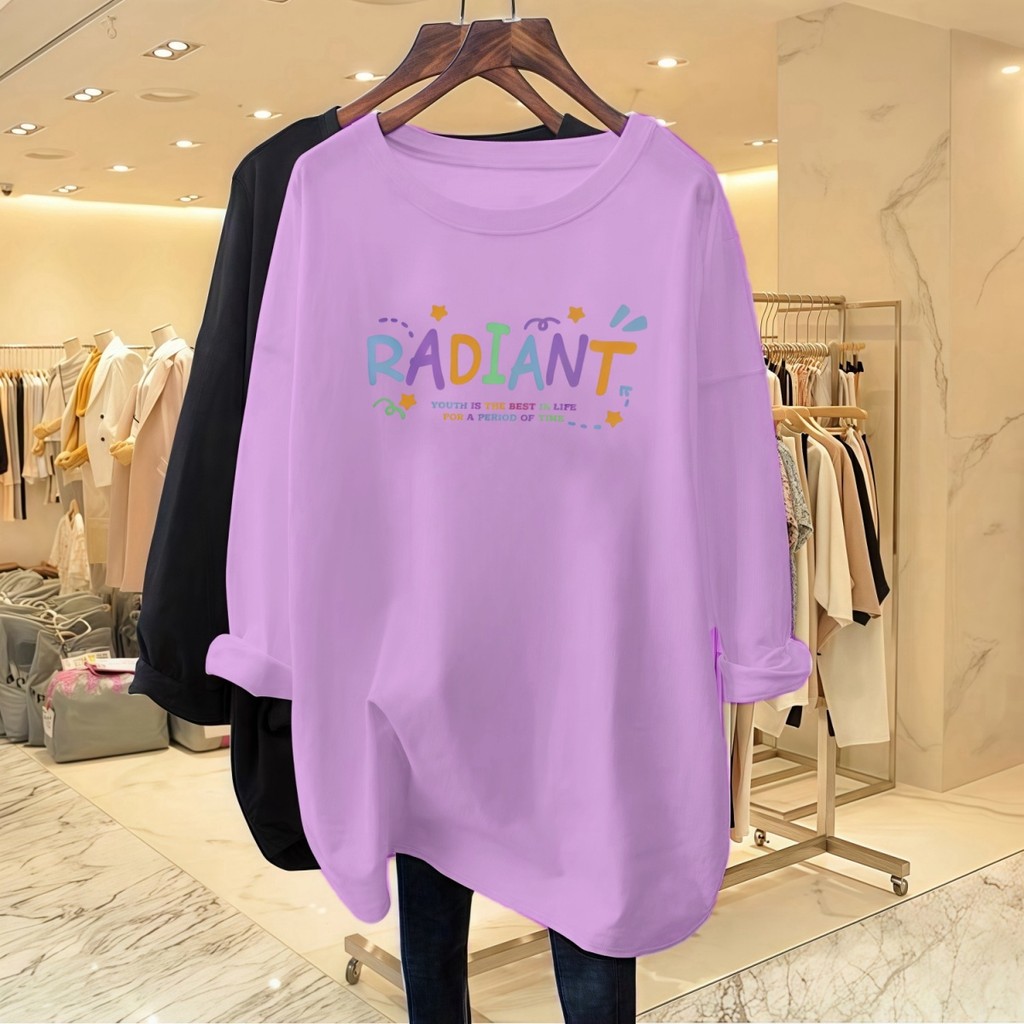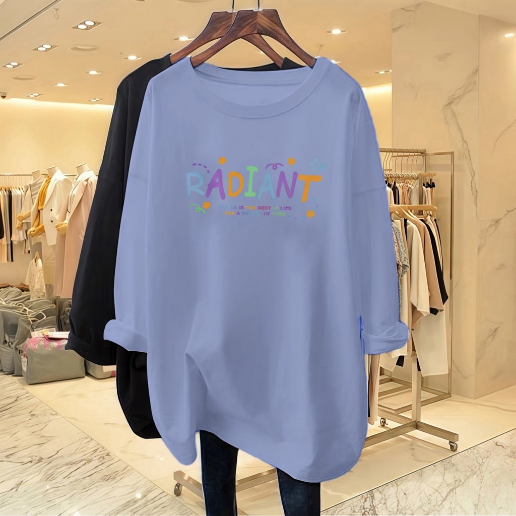 Plus Size Long-sleeved Women's T-shirt Printed with Colored Letters College Style Simple Large Size Top Soft Round Neck Summer Women's Clothing Baju-t Suitable for 43-95KG