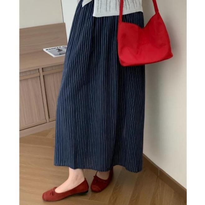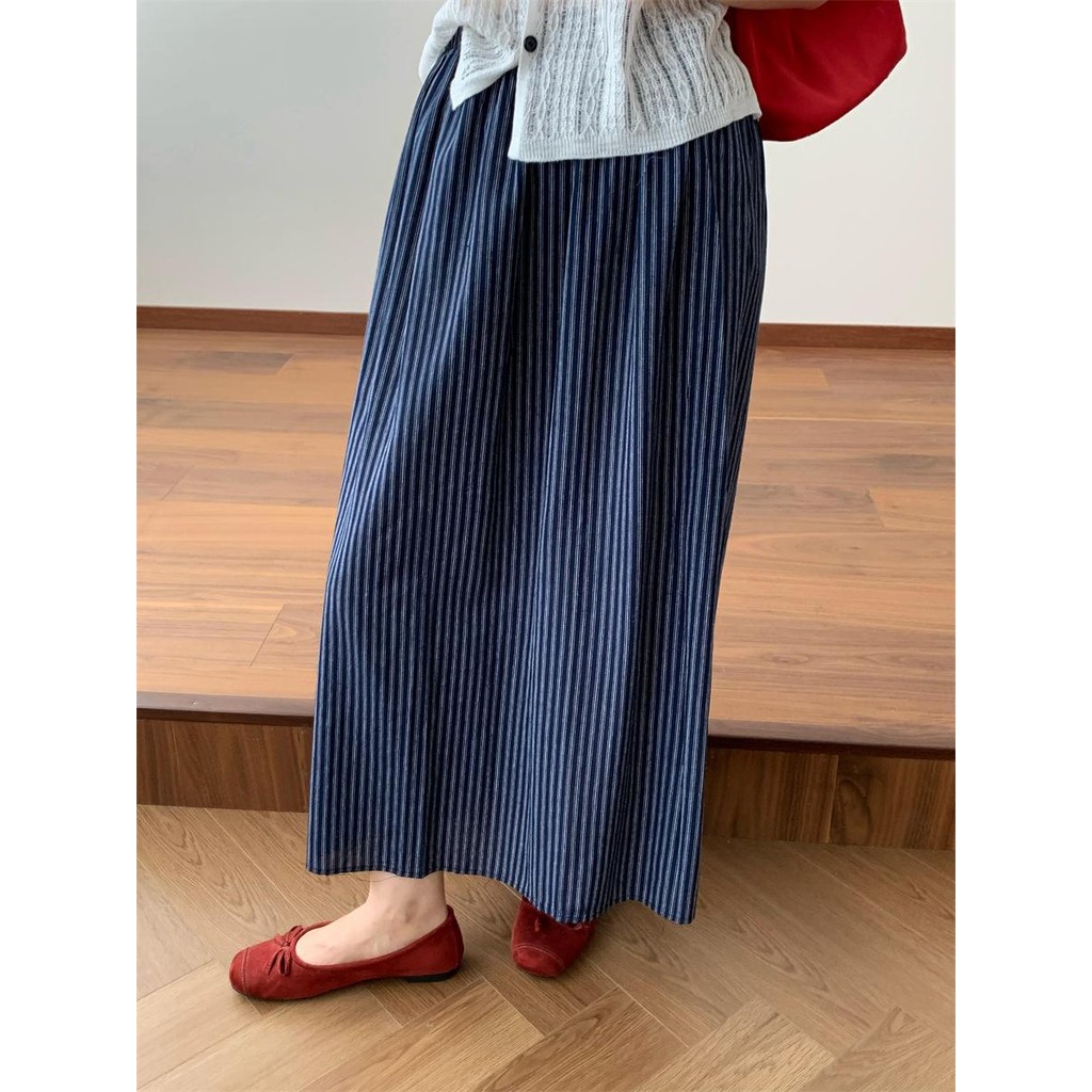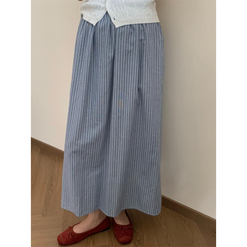 99093-Retro striped cotton skirt with elastic waist and A-line mid-length summer straight skirt