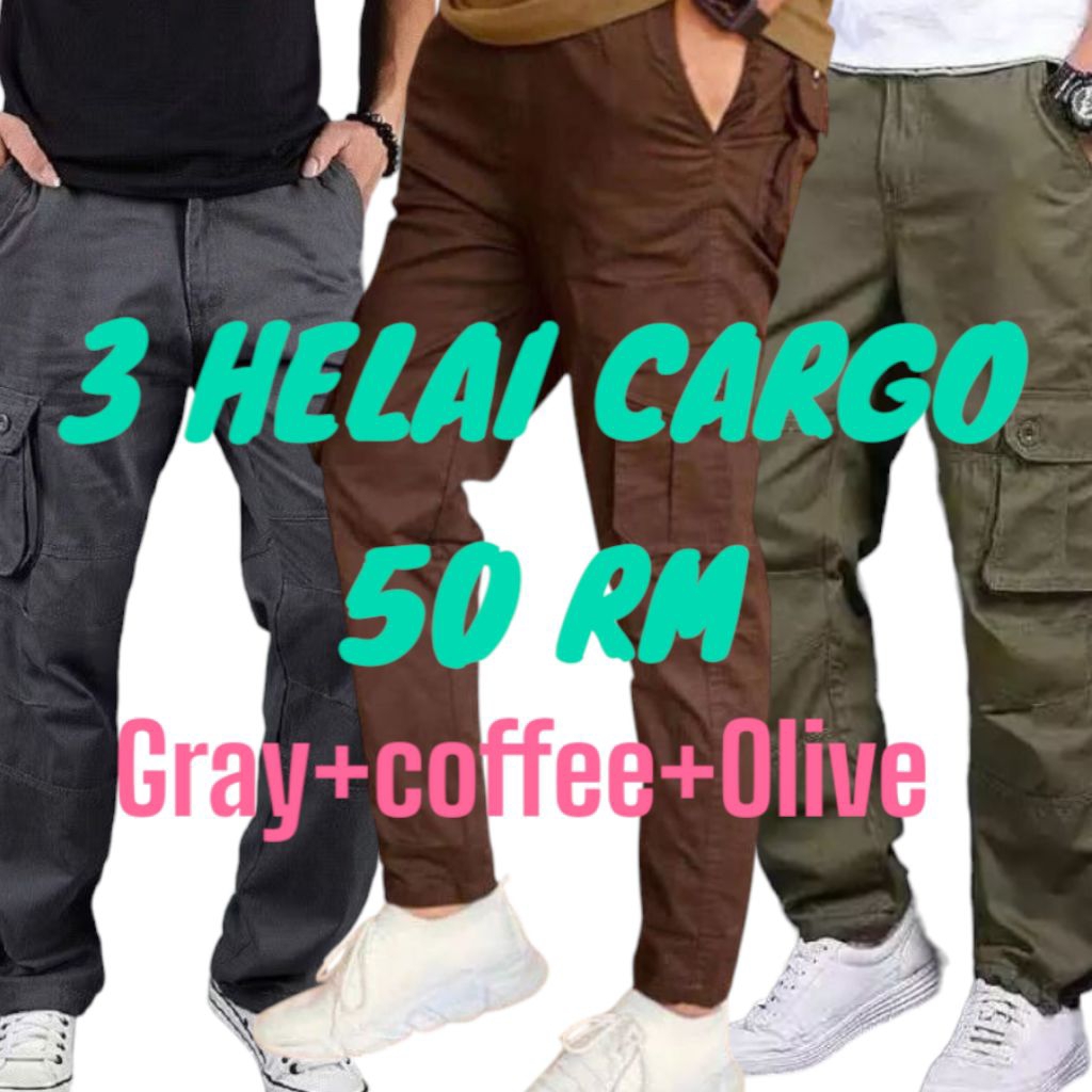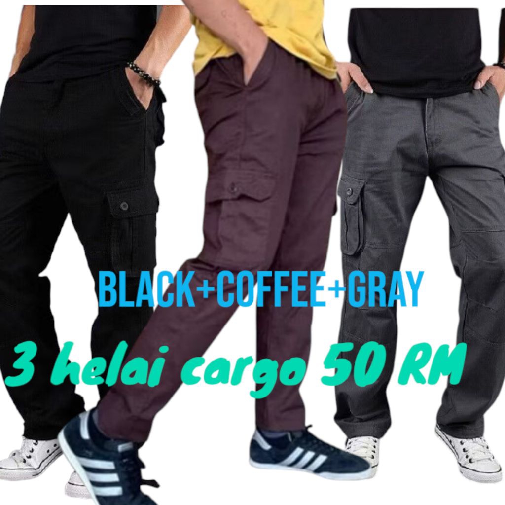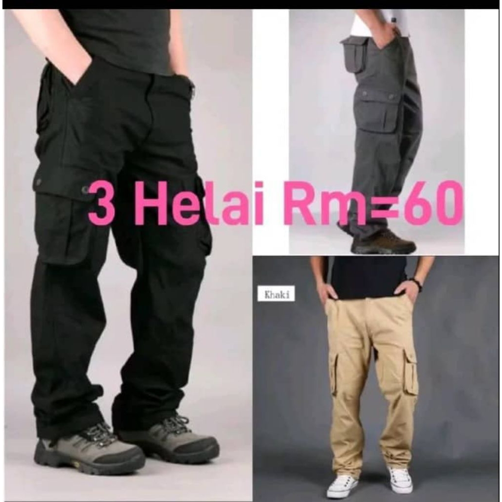 [ 3 HELAI CARGO PANTS ] men's cargo six pocket pant kain 100℅ cotton strechable straight cut kerja pant pakai Belt