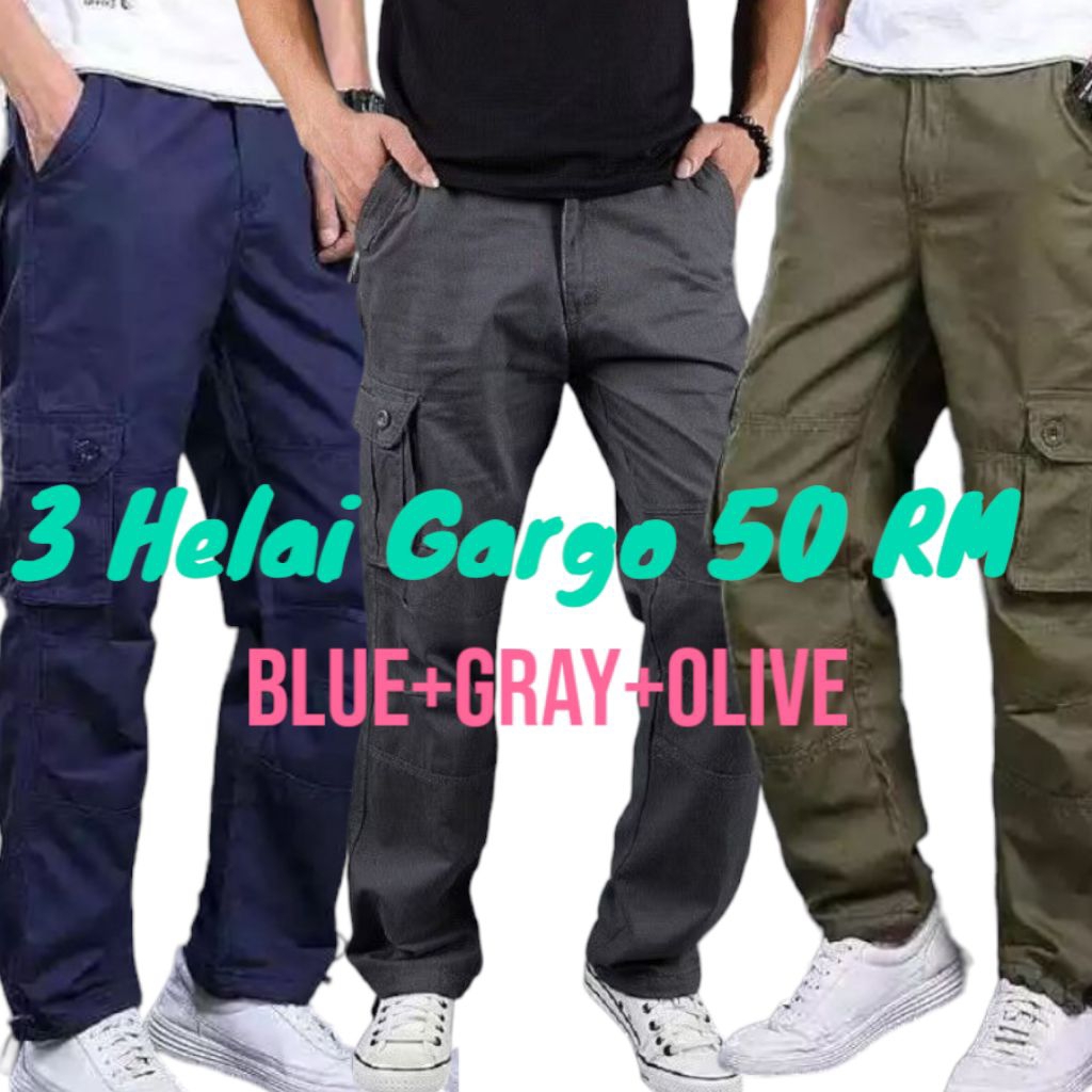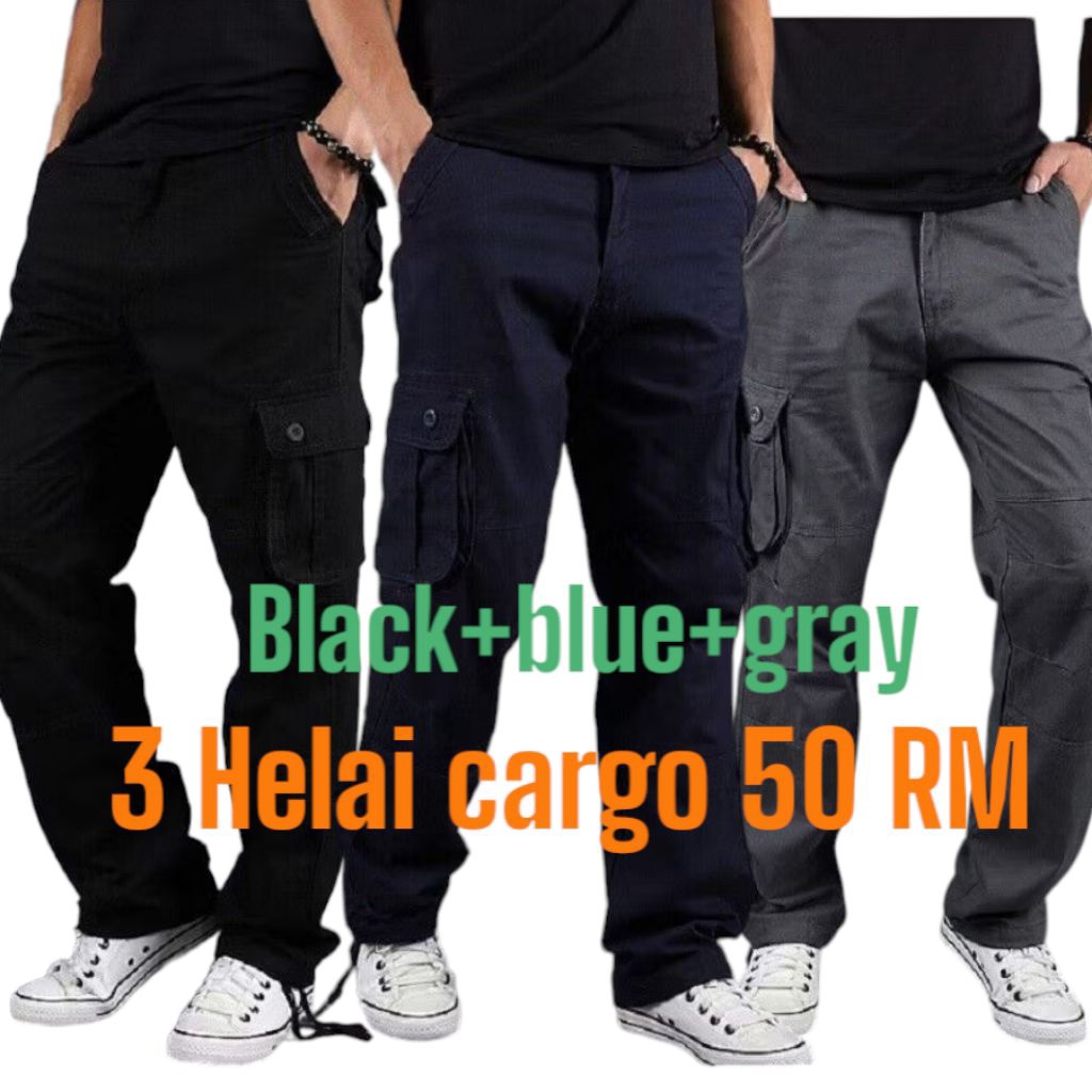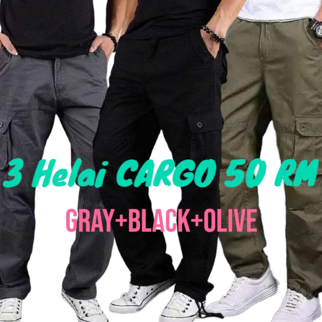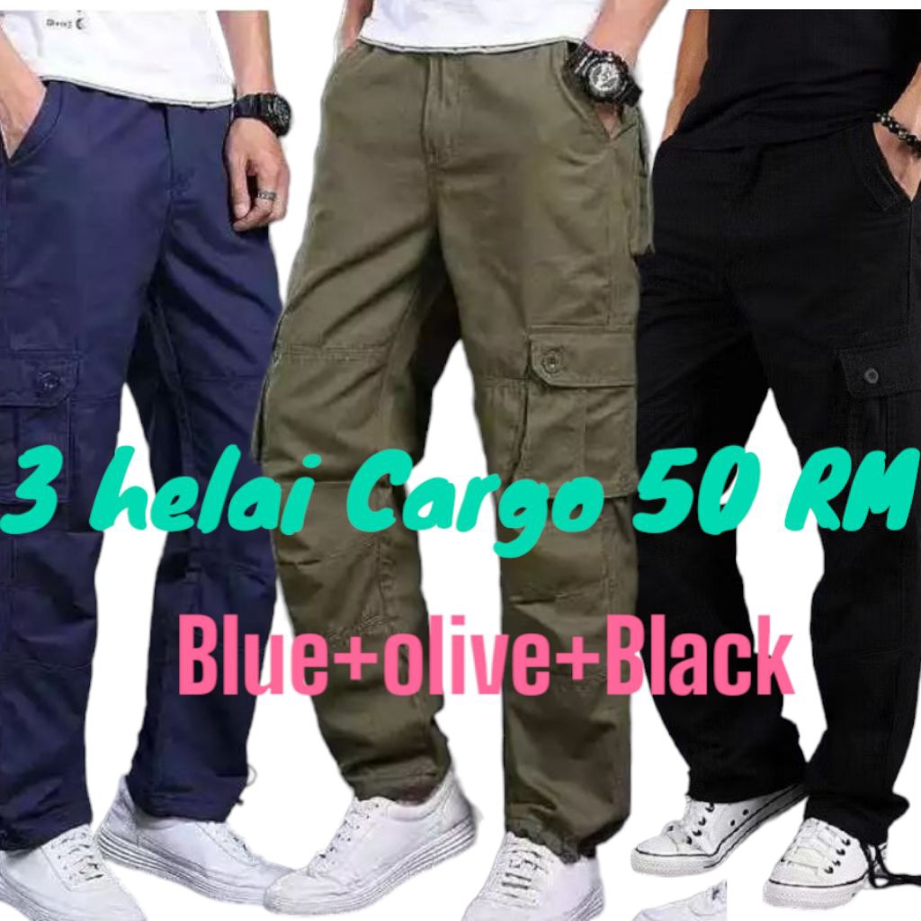 [ 3 HELAI CARGO PANTS ] men's cargo six pocket pant kain 100℅ cotton strechable straight cut kerja pant pakai Belt