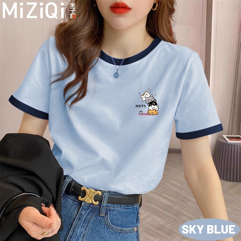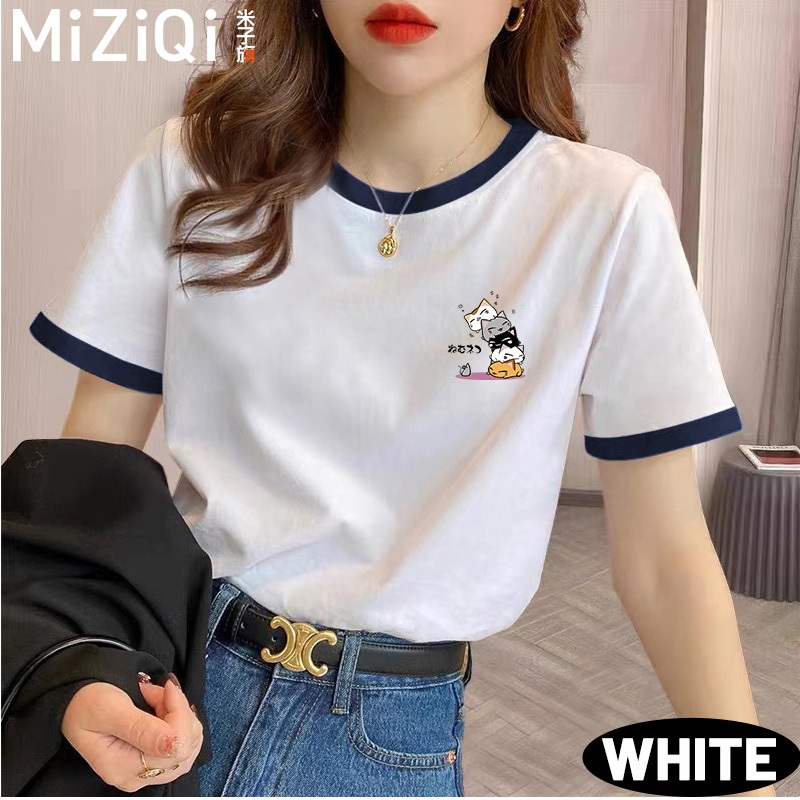 MIZIQI Summer Korean Casual Style Printed Loose T-Shirt 100% Cotton Contrast Color Round Neck Short-Sleeved Women's Clothing New
