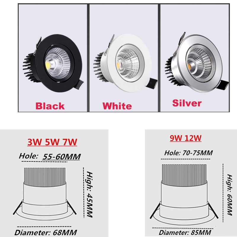 LED COB Downlight Tri-color Recessed Spotlight 3w 5w 7w 12w 220V Aluminum Down Lamp