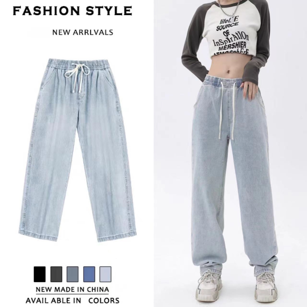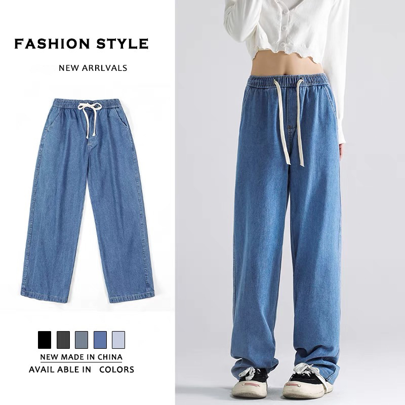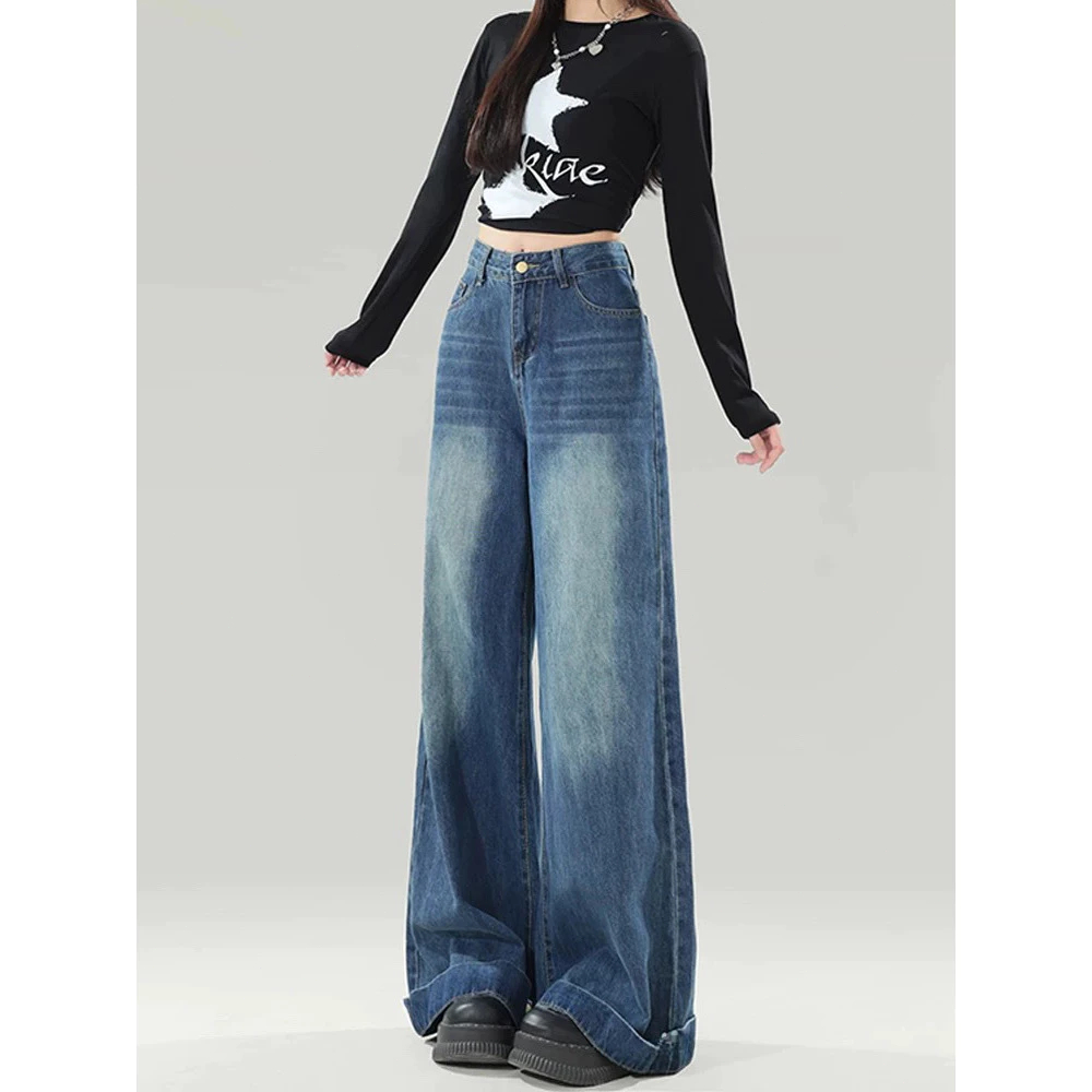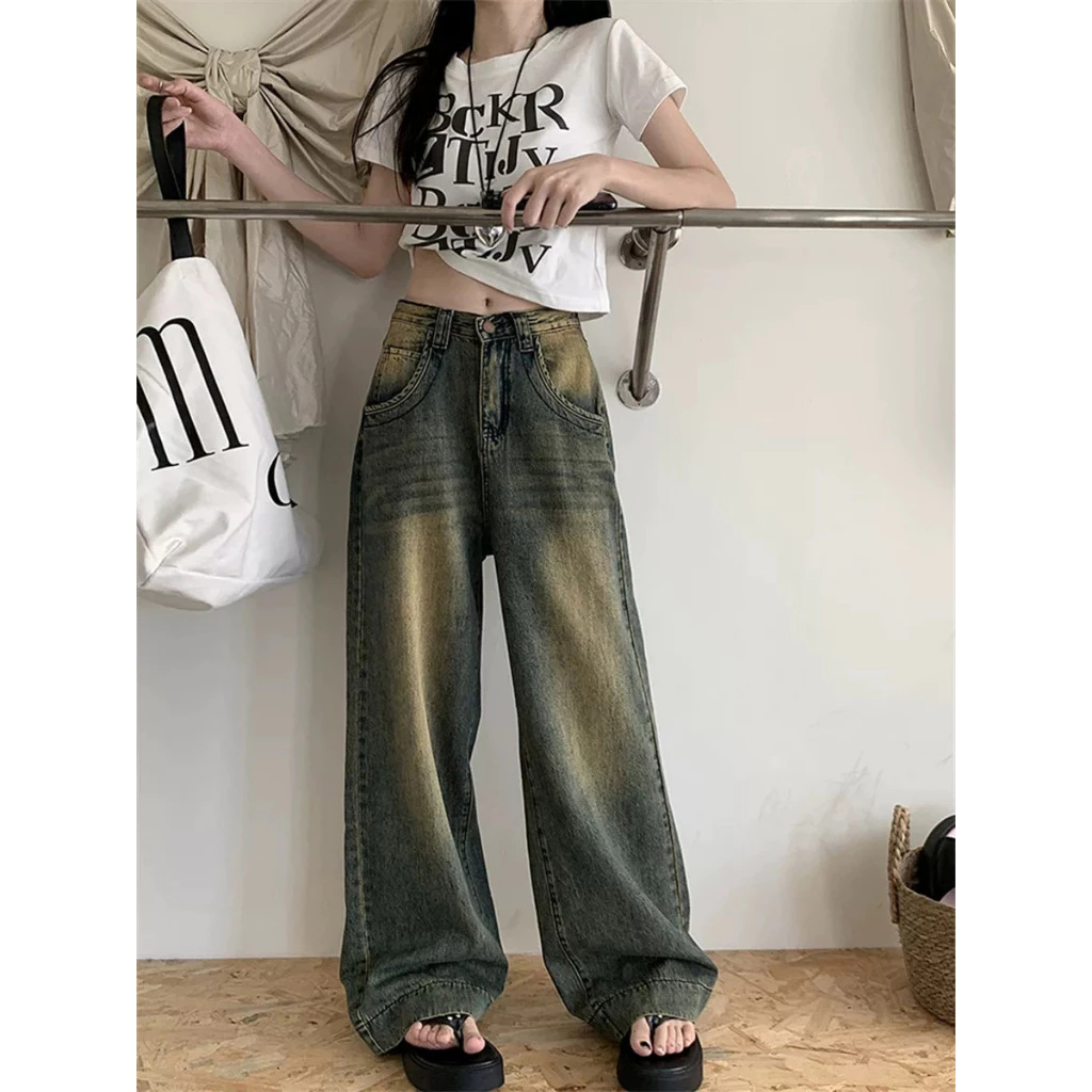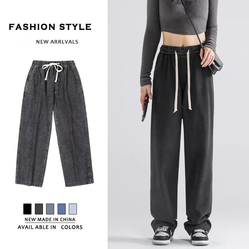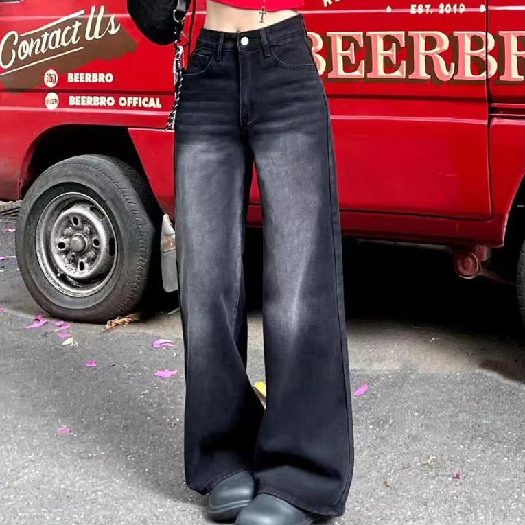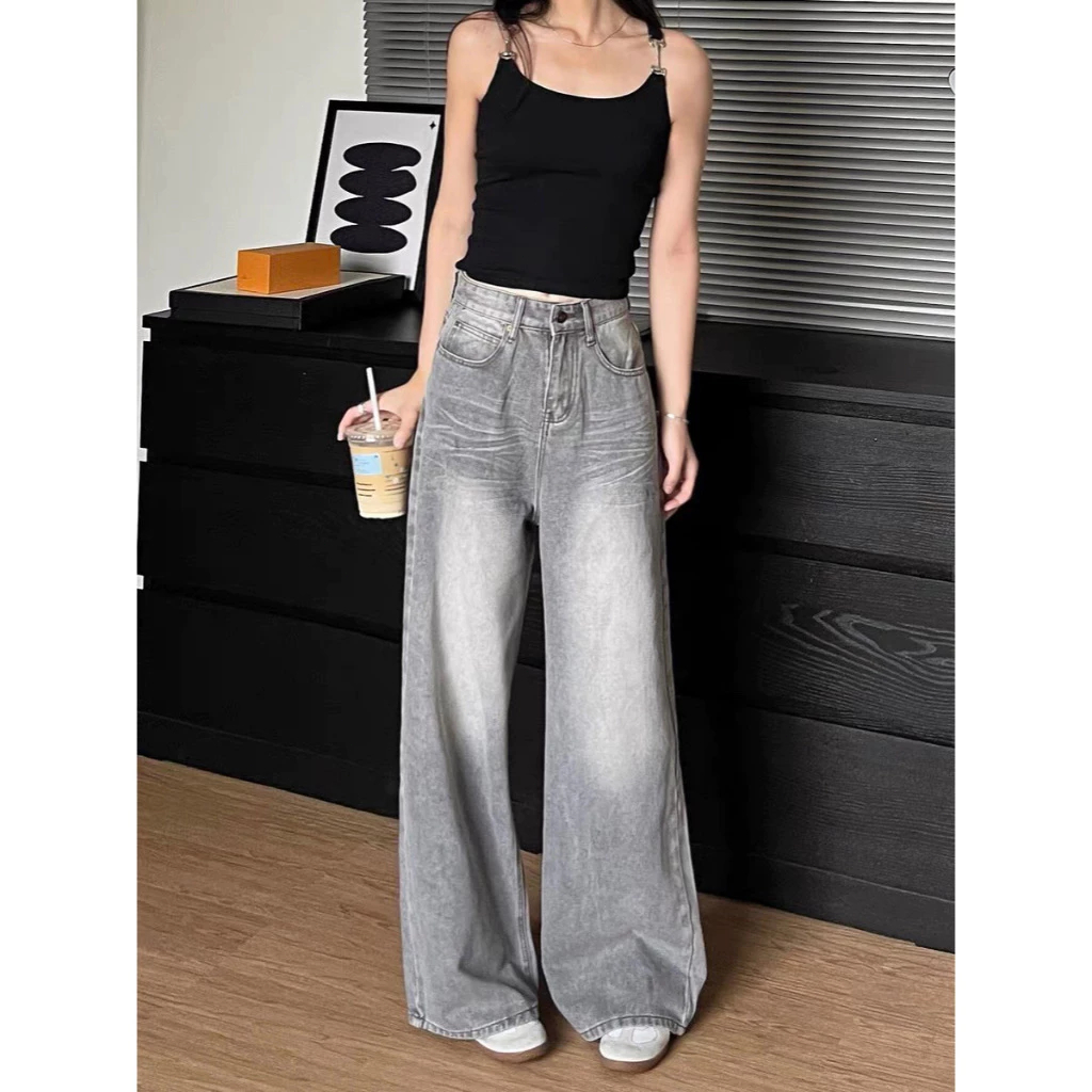 GEE Gray jeans washed loose trousers casual wide-leg pants women's high waist straight pants