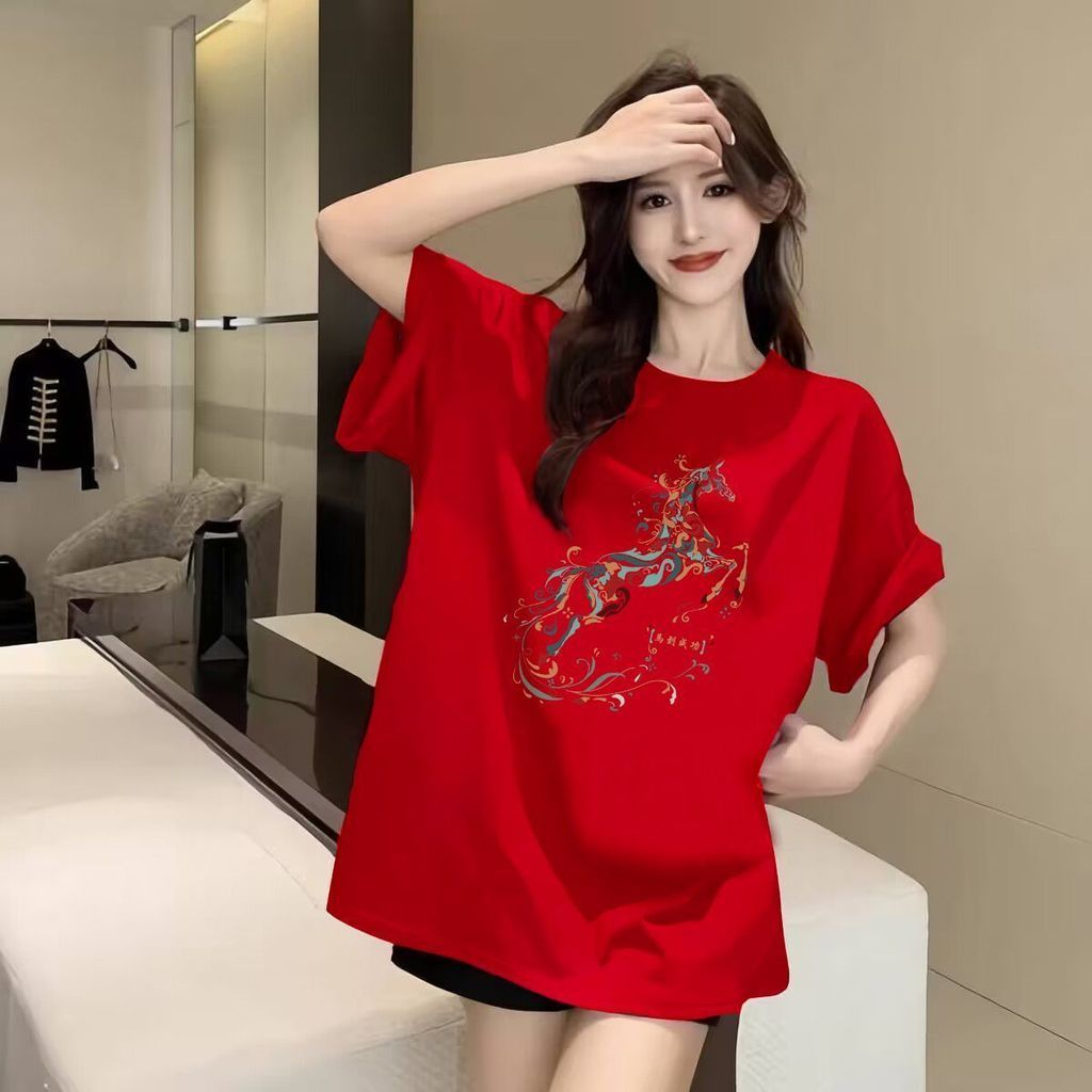 新年喜庆红色牛奶丝短袖t恤女2026马年本命年衣服宽松大码上衣潮New Year Festive Red Milk Silk Short-sleeved T-shirt Female 220251227S-5XL
