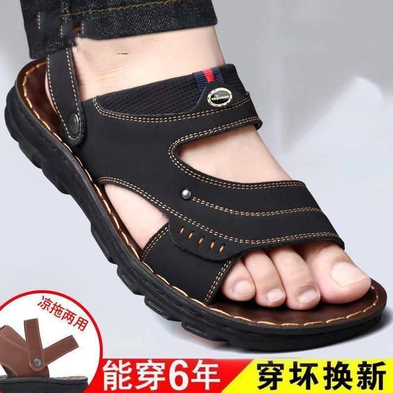 sandal lelaki men sandal kasut sandal lelaki Sandals Men 2025 New Style Genuine Leather Thick-Soled Beach Summer Outer Wear Dad Anti-Slip Wear-Resistant Dual-Use Sandals Slippers