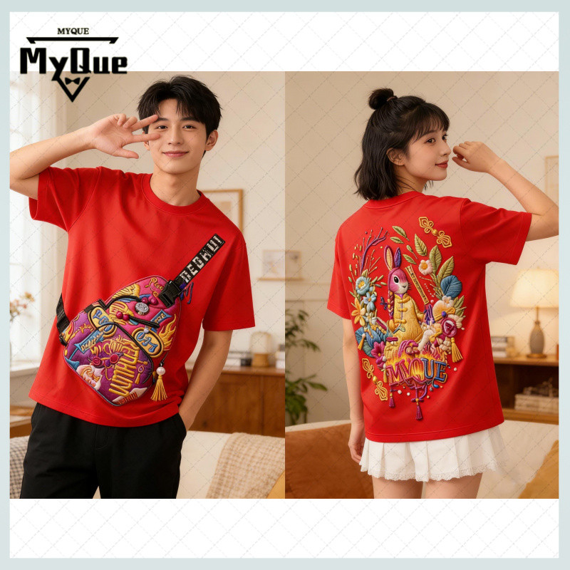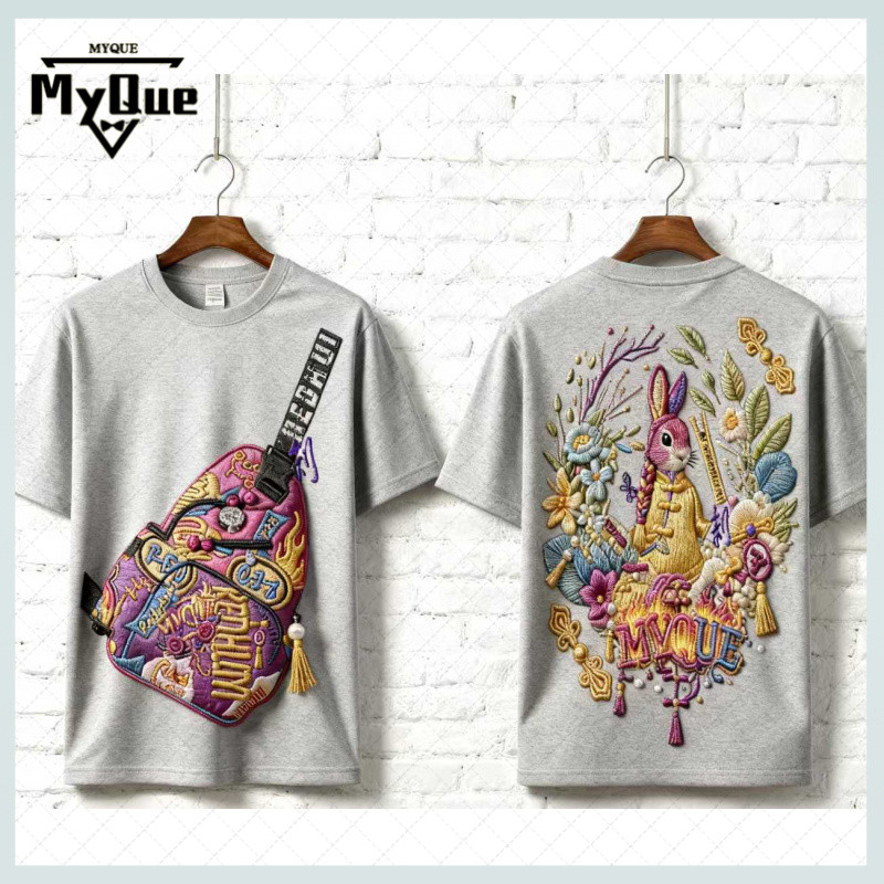 【MYQue潮牌爆款】T-Shirt Longgar Trendy Unisex 新中式复古国潮兔3D立体仿刺绣印花T恤 兔年生肖国潮斜挎包设计潮流宽松短袖男女款上衣